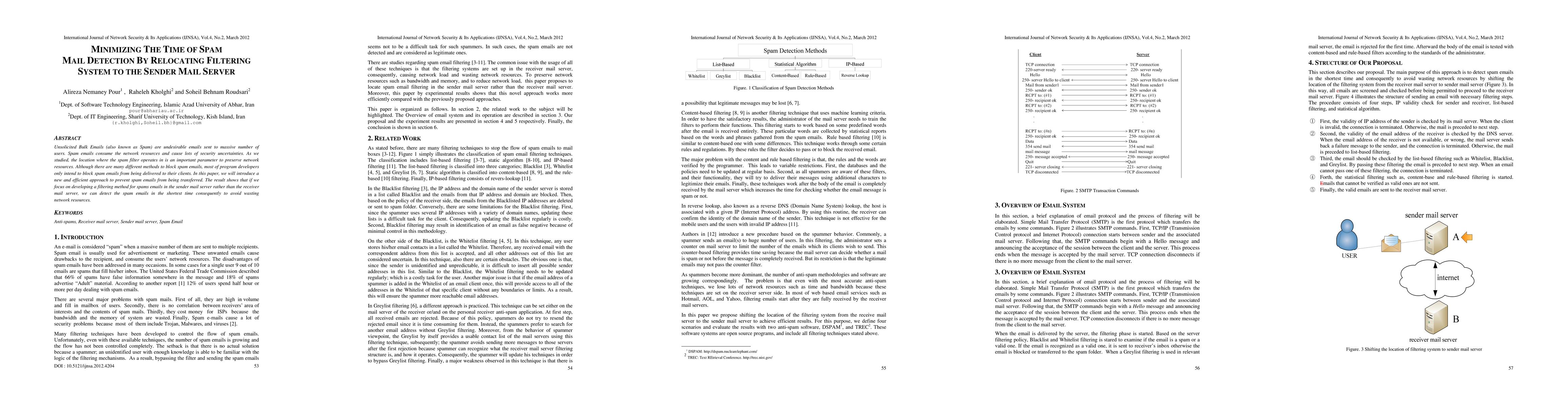 This paper proposes relocating spam filtering to the sender mail server to minimize detection time and conserve network resources. By implementing filtering at the source, spam emails are intercepted before they are transmitted, reducing unnecessary network usage and security risks.