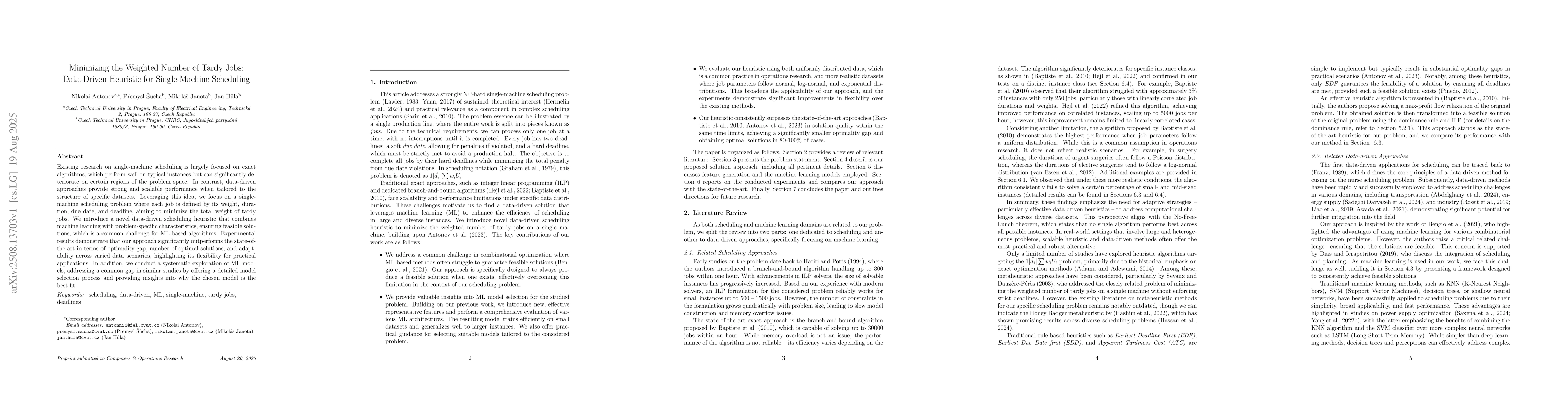 The research introduces a data-driven heuristic for single-machine scheduling, combining machine learning with problem-specific characteristics to minimize the total weight of tardy jobs. It systematically explores ML models, offering a detailed model selection process, and ensures feasible solutions.