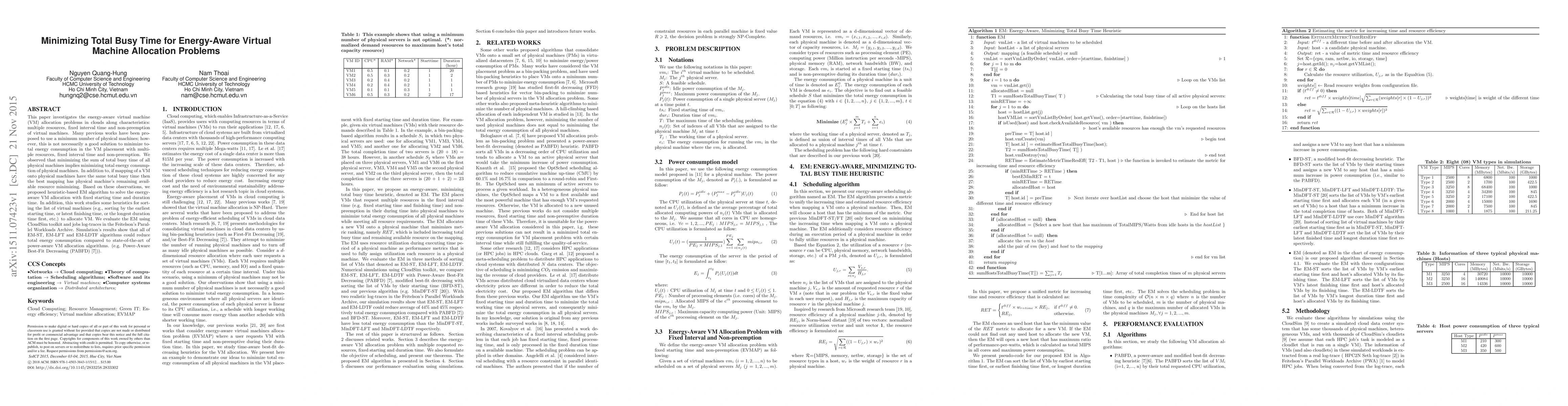 This paper proposes a heuristic-based EM algorithm to minimize total energy consumption in energy-aware virtual machine allocation by focusing on reducing the total busy time of physical machines. Simulation results show that the EM algorithm outperforms existing power-aware VM allocation methods in reducing energy consumption.