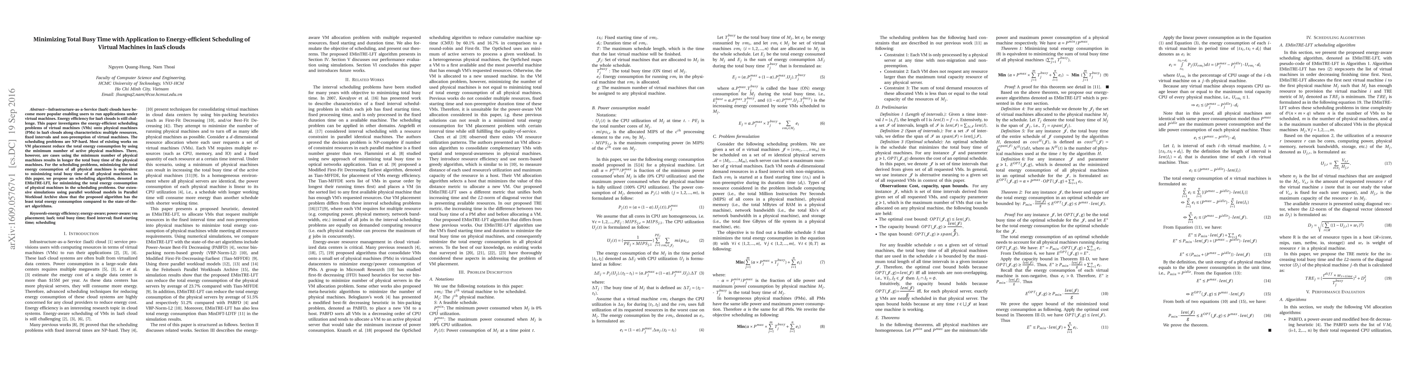 Infrastructure-as-a-Service (IaaS) clouds have become more popular enabling users to run applications under virtual machines. Energy efficiency for IaaS clouds is still challenge. This paper investigates the energy-efficient scheduling problems of virtual machines (VMs) onto physical machines (PMs) in IaaS clouds along characteristics: multiple resources, fixed intervals and non-preemption of virtual machines. The scheduling problems are NP-hard. Most of existing works on VM placement reduce the total energy consumption by using the minimum number of active physical machines. There, however, are cases using the minimum number of physical machines results in longer the total busy time of the physical machines. For the scheduling problems, minimizing the total energy consumption of all physical machines is equivalent to minimizing total busy time of all physical machines. In this paper, we propose an scheduling algorithm, denoted as EMinTRE-LFT, for minimizing the total energy consumption of physical machines in the scheduling problems. Our extensive simulations using parallel workload models in Parallel Workload Archive show that the proposed algorithm has the least total energy consumption compared to the state-of-the art algorithms.