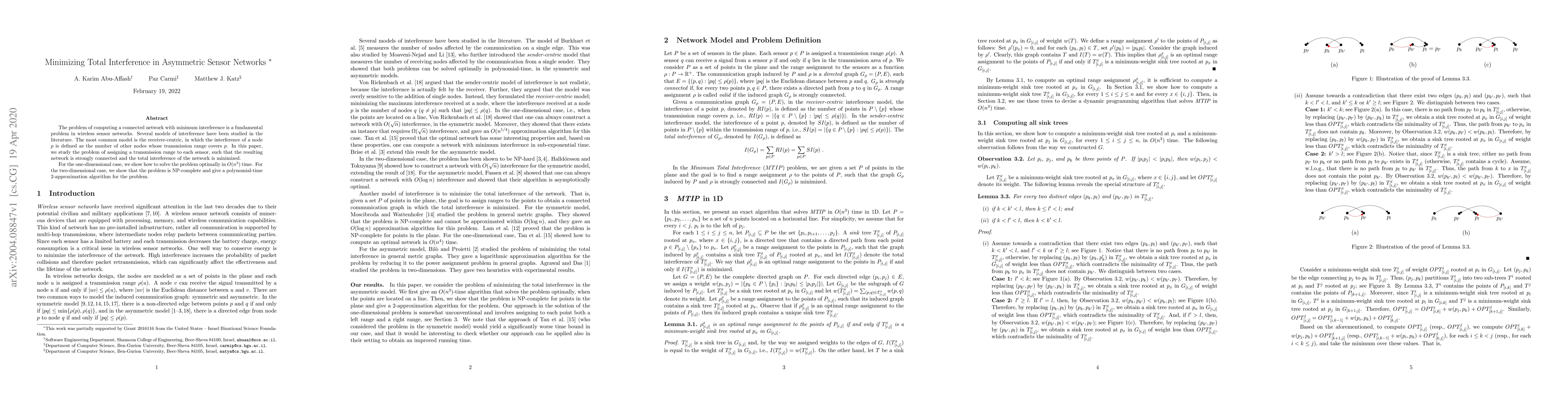 The problem of computing a connected network with minimum interference is a fundamental problem in wireless sensor networks. Several models of interference have been studied in the literature. The most common model is the receiver-centric, in which the interference of a node $p$ is defined as the number of other nodes whose transmission range covers $p$. In this paper, we study the problem of assigning a transmission range to each sensor, such that the resulting network is strongly connected and the total interference of the network is minimized. For the one-dimensional case, we show how to solve the problem optimally in $O(n^3)$ time. For the two-dimensional case, we show that the problem is NP-complete and give a polynomial-time 2-approximation algorithm for the problem.