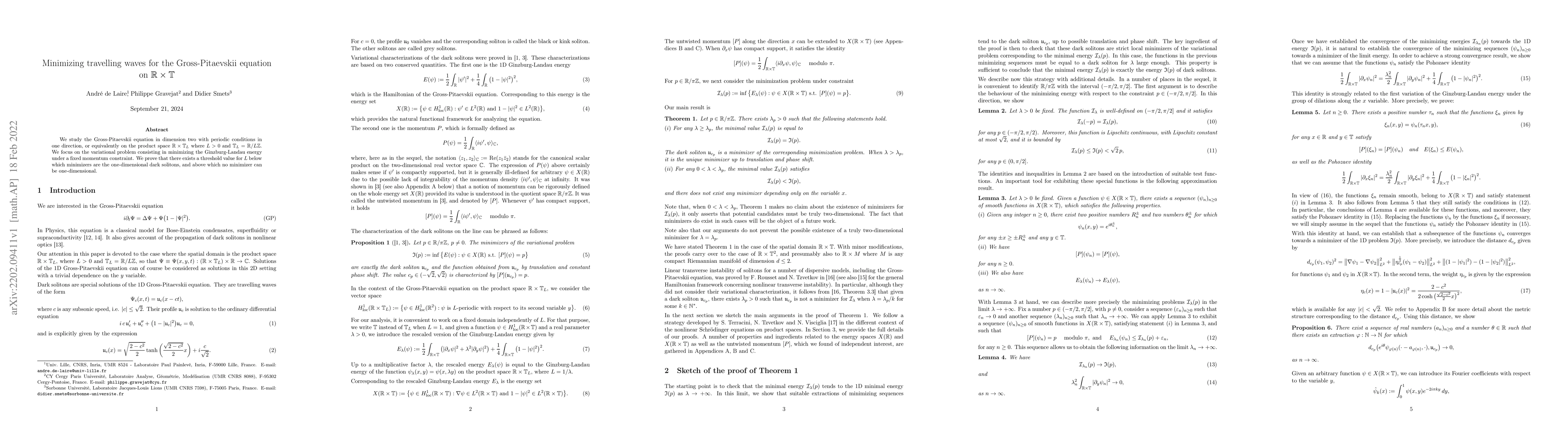 This paper investigates the Gross-Pitaevskii equation in two dimensions with periodic boundary conditions, focusing on minimizing the Ginzburg-Landau energy under a fixed momentum constraint. It establishes a threshold value for the period below which one-dimensional dark solitons are the minimizers, while above this threshold, no one-dimensional minimizer exists.