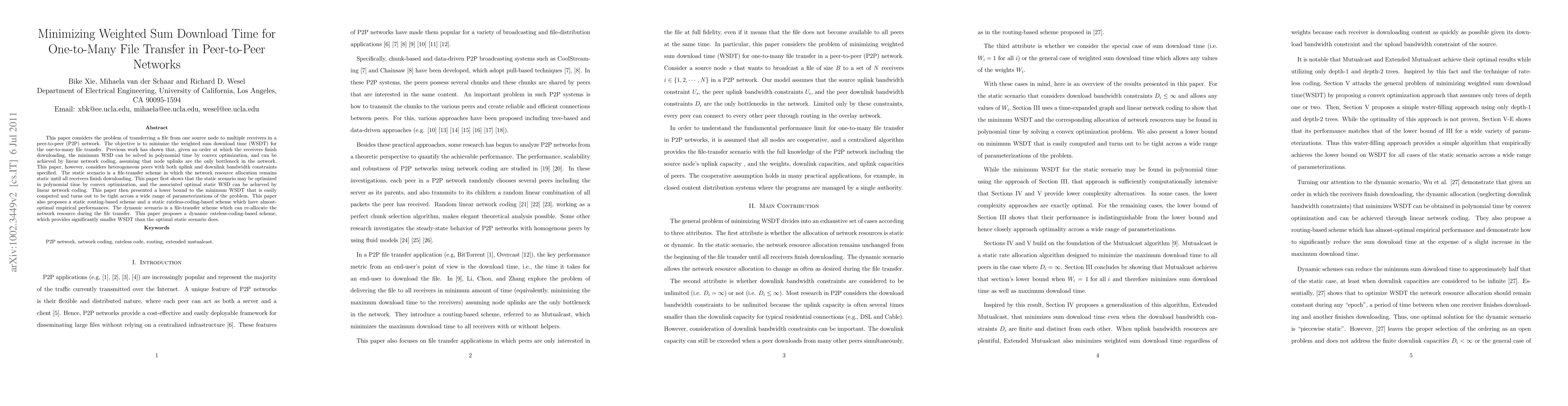 This paper considers the problem of transferring a file from one source node to multiple receivers in a peer-to-peer (P2P) network. The objective is to minimize the weighted sum download time (WSDT) for the one-to-many file transfer. Previous work has shown that, given an order at which the receivers finish downloading, the minimum WSD can be solved in polynomial time by convex optimization, and can be achieved by linear network coding, assuming that node uplinks are the only bottleneck in the network. This paper, however, considers heterogeneous peers with both uplink and downlink bandwidth constraints specified. The static scenario is a file-transfer scheme in which the network resource allocation remains static until all receivers finish downloading. This paper first shows that the static scenario may be optimized in polynomial time by convex optimization, and the associated optimal static WSD can be achieved by linear network coding. This paper then presented a lower bound to the minimum WSDT that is easily computed and turns out to be tight across a wide range of parameterizations of the problem. This paper also proposes a static routing-based scheme and a static rateless-coding-based scheme which have almost-optimal empirical performances. The dynamic scenario is a file-transfer scheme which can re-allocate the network resource during the file transfer. This paper proposes a dynamic rateless-coding-based scheme, which provides significantly smaller WSDT than the optimal static scenario does.