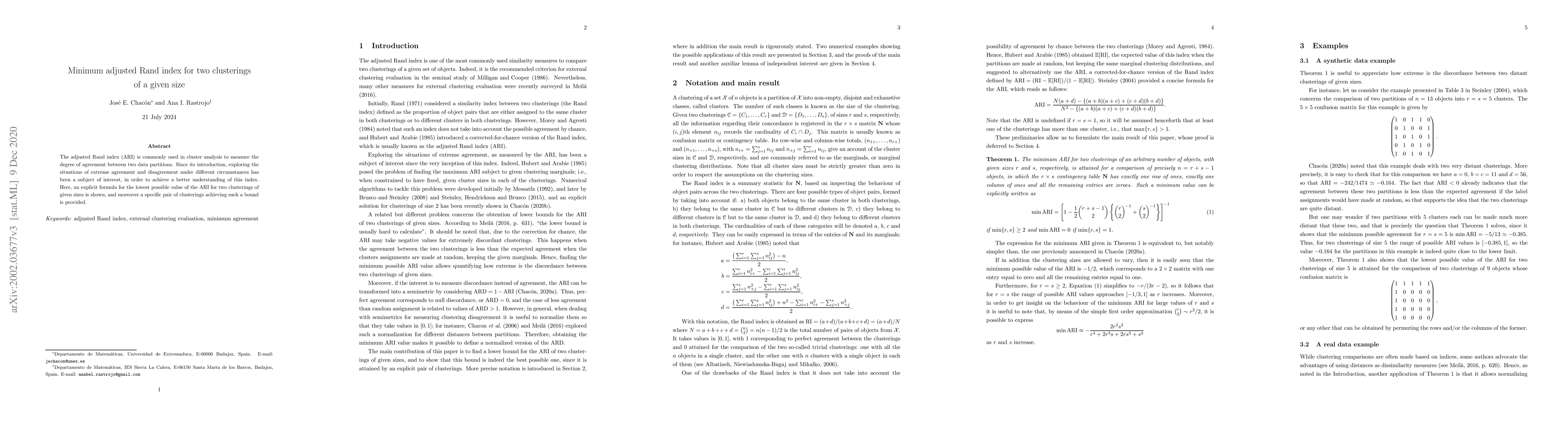 The adjusted Rand index (ARI) is commonly used in cluster analysis to measure the degree of agreement between two data partitions. Since its introduction, exploring the situations of extreme agreement and disagreement under different circumstances has been a subject of interest, in order to achieve a better understanding of this index. Here, an explicit formula for the lowest possible value of the ARI for two clusterings of given sizes is shown, and moreover a specific pair of clusterings achieving such a bound is provided.