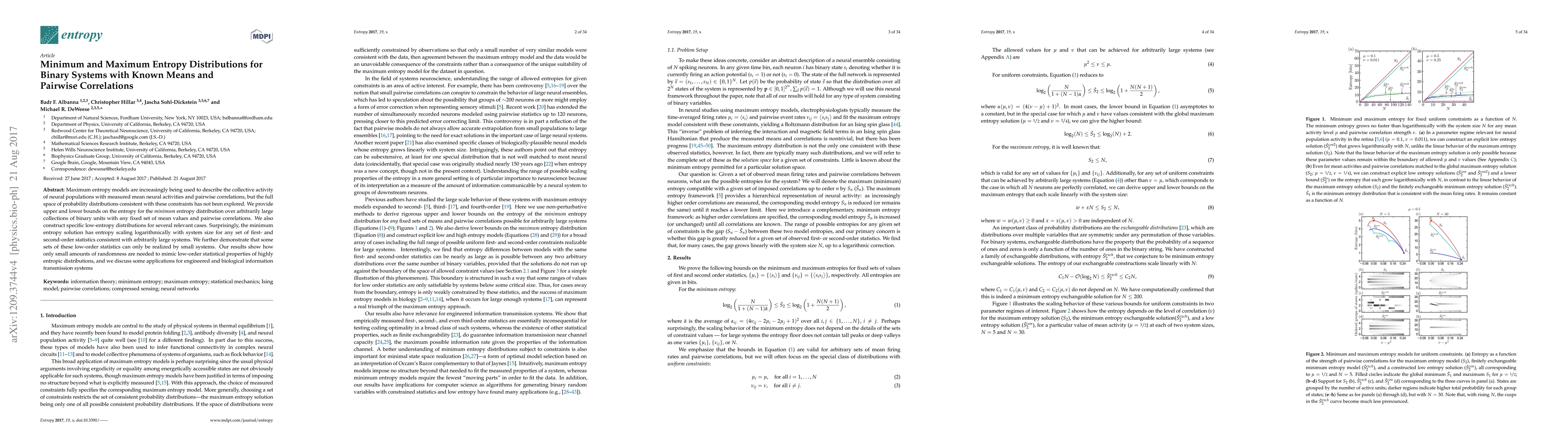 This paper explores the full range of entropy for binary systems with known mean activities and pairwise correlations, providing upper and lower bounds on entropy. It reveals that the minimum entropy distribution scales logarithmically with system size, indicating that small amounts of randomness can mimic low-order statistical properties of large, highly entropic distributions.