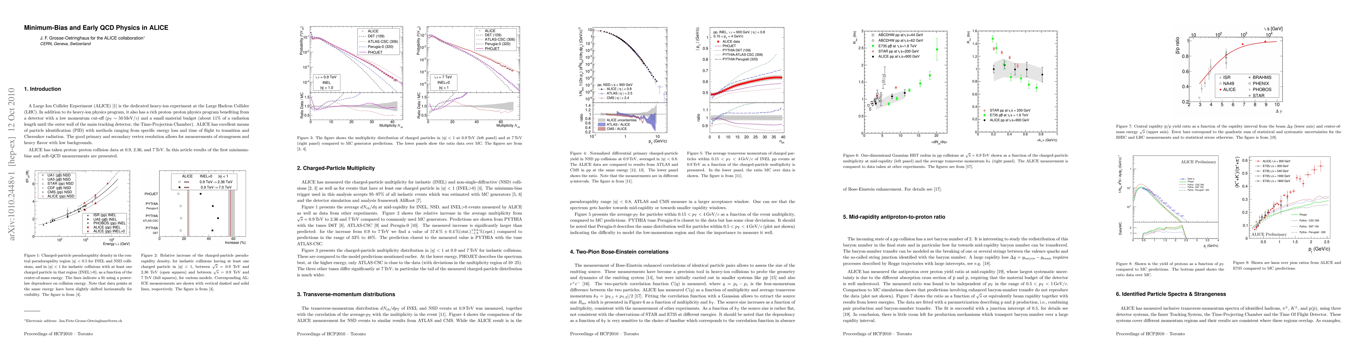 The ALICE experiment at the LHC presents initial results from minimum-bias and soft-QCD proton-proton collisions, detailing inclusive distributions and identified particle yields, alongside two-pion correlations and antiproton-to-proton ratios. These findings leverage ALICE's extensive particle identification and low momentum detection capabilities.