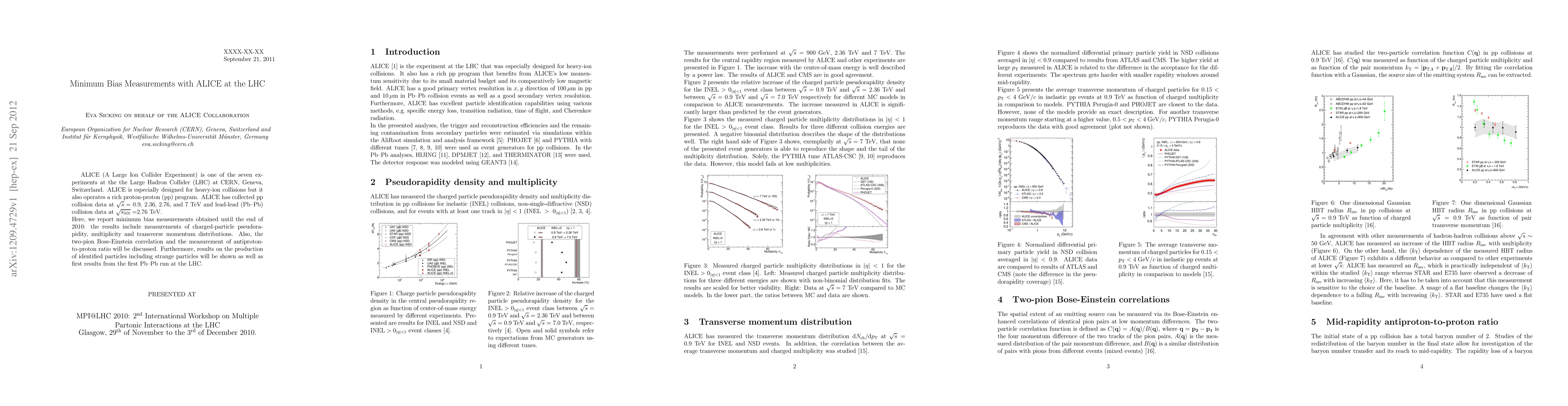 This paper reports on minimum bias measurements from ALICE at the LHC, detailing charged-particle pseudorapidity, multiplicity, and transverse momentum distributions, along with the two-pion Bose-Einstein correlation and antiproton-to-proton ratio, and initial results from lead-lead collisions.