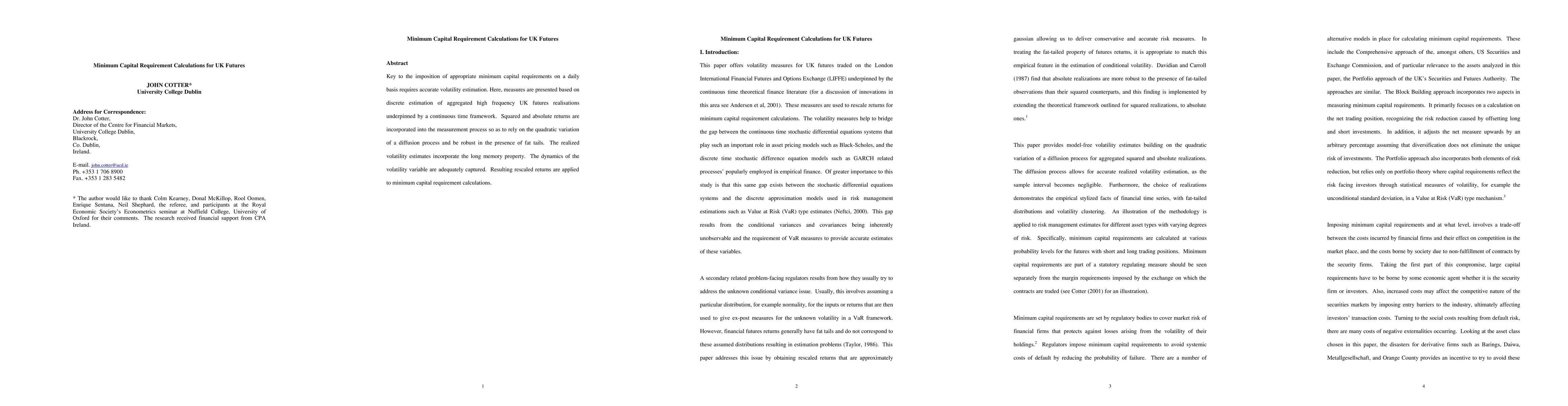 Key to the imposition of appropriate minimum capital requirements on a daily basis requires accurate volatility estimation. Here, measures are presented based on discrete estimation of aggregated high frequency UK futures realisations underpinned by a continuous time framework. Squared and absolute returns are incorporated into the measurement process so as to rely on the quadratic variation of a diffusion process and be robust in the presence of fat tails. The realized volatility estimates incorporate the long memory property. The dynamics of the volatility variable are adequately captured. Resulting rescaled returns are applied to minimum capital requirement calculations.