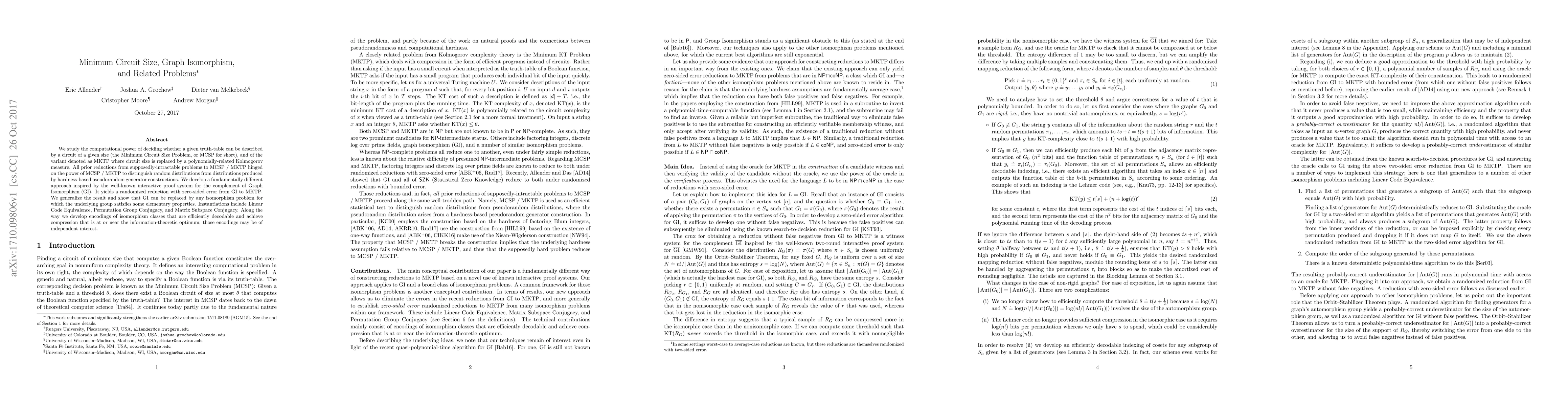 We study the computational power of deciding whether a given truth-table can be described by a circuit of a given size (the Minimum Circuit Size Problem, or MCSP for short), and of the variant denoted as MKTP where circuit size is replaced by a polynomially-related Kolmogorov measure. All prior reductions from supposedly-intractable problems to MCSP / MKTP hinged on the power of MCSP / MKTP to distinguish random distributions from distributions produced by hardness-based pseudorandom generator constructions. We develop a fundamentally different approach inspired by the well-known interactive proof system for the complement of Graph Isomorphism (GI). It yields a randomized reduction with zero-sided error from GI to MKTP. We generalize the result and show that GI can be replaced by any isomorphism problem for which the underlying group satisfies some elementary properties. Instantiations include Linear Code Equivalence, Permutation Group Conjugacy, and Matrix Subspace Conjugacy. Along the way we develop encodings of isomorphism classes that are efficiently decodable and achieve compression that is at or near the information-theoretic optimum; those encodings may be of independent interest.