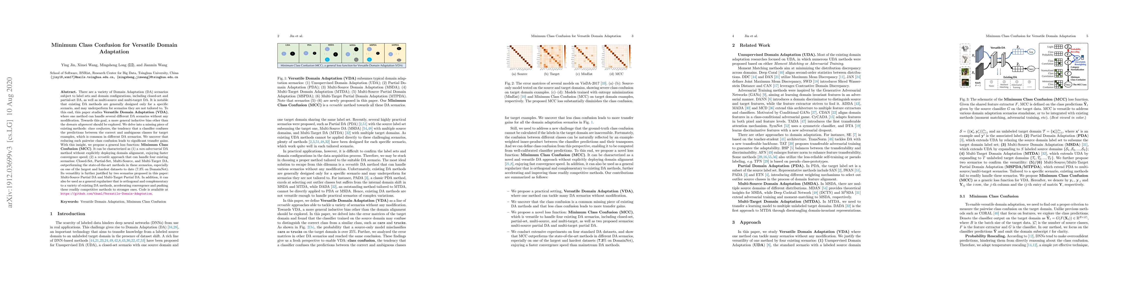 There are a variety of Domain Adaptation (DA) scenarios subject to label sets and domain configurations, including closed-set and partial-set DA, as well as multi-source and multi-target DA. It is notable that existing DA methods are generally designed only for a specific scenario, and may underperform for scenarios they are not tailored to. To this end, this paper studies Versatile Domain Adaptation (VDA), where one method can handle several different DA scenarios without any modification. Towards this goal, a more general inductive bias other than the domain alignment should be explored. We delve into a missing piece of existing methods: class confusion, the tendency that a classifier confuses the predictions between the correct and ambiguous classes for target examples, which is common in different DA scenarios. We uncover that reducing such pairwise class confusion leads to significant transfer gains. With this insight, we propose a general loss function: Minimum Class Confusion (MCC). It can be characterized as (1) a non-adversarial DA method without explicitly deploying domain alignment, enjoying faster convergence speed; (2) a versatile approach that can handle four existing scenarios: Closed-Set, Partial-Set, Multi-Source, and Multi-Target DA, outperforming the state-of-the-art methods in these scenarios, especially on one of the largest and hardest datasets to date (7.3% on DomainNet). Its versatility is further justified by two scenarios proposed in this paper: Multi-Source Partial DA and Multi-Target Partial DA. In addition, it can also be used as a general regularizer that is orthogonal and complementary to a variety of existing DA methods, accelerating convergence and pushing these readily competitive methods to stronger ones. Code is available at https://github.com/thuml/Versatile-Domain-Adaptation.