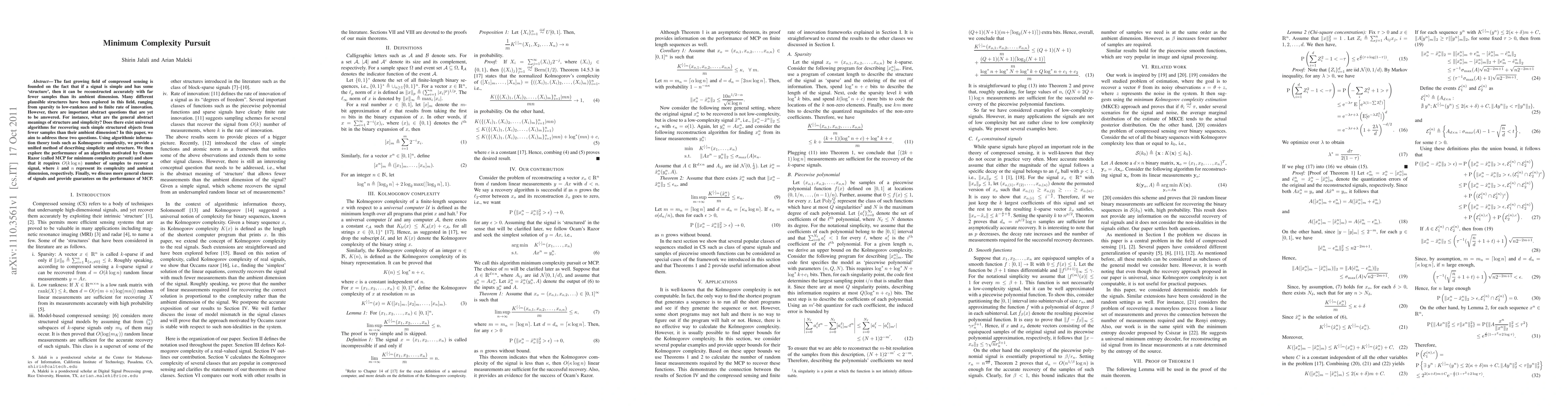 The fast growing field of compressed sensing is founded on the fact that if a signal is 'simple' and has some 'structure', then it can be reconstructed accurately with far fewer samples than its ambient dimension. Many different plausible structures have been explored in this field, ranging from sparsity to low-rankness and to finite rate of innovation. However, there are important abstract questions that are yet to be answered. For instance, what are the general abstract meanings of 'structure' and 'simplicity'? Do there exist universal algorithms for recovering such simple structured objects from fewer samples than their ambient dimension? In this paper, we aim to address these two questions. Using algorithmic information theory tools such as Kolmogorov complexity, we provide a unified method of describing 'simplicity' and 'structure'. We then explore the performance of an algorithm motivated by Ocam's Razor (called MCP for minimum complexity pursuit) and show that it requires $O(k\log n)$ number of samples to recover a signal, where $k$ and $n$ represent its complexity and ambient dimension, respectively. Finally, we discuss more general classes of signals and provide guarantees on the performance of MCP.