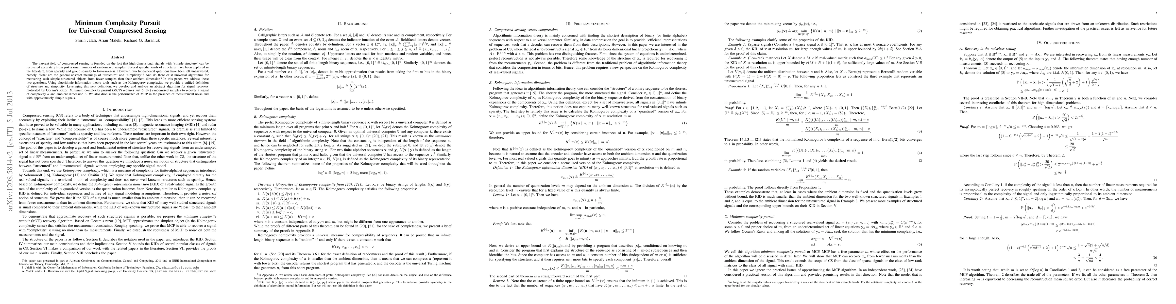 A new algorithm called Minimum Complexity Pursuit (MCP) recovers signals from just O(3 times the complexity) random samples, answering long-standing questions in compressed sensing about simplicity and universal recovery methods.