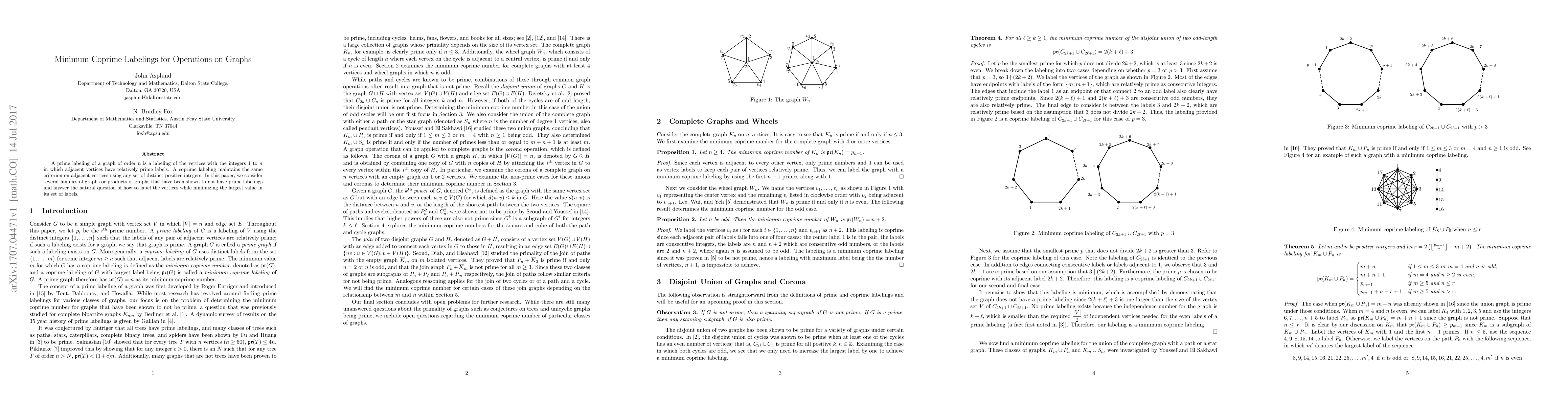 This paper investigates minimum coprime labelings for various graph families, focusing on labeling vertices with distinct positive integers such that adjacent vertices have relatively prime labels, and explores the smallest possible maximum label in these configurations.