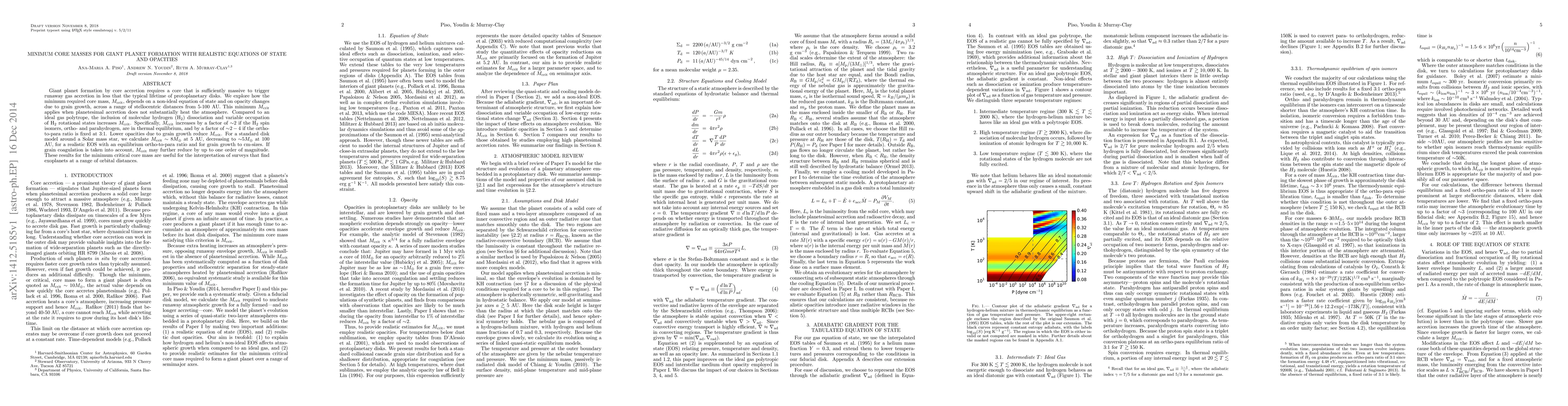 This paper investigates the minimum core mass required for giant planet formation via core accretion, considering realistic equations of state and opacities. The study finds that M_crit increases by a factor of ~2-4 due to molecular hydrogen dissociation and changes in H_2 spin isomers, while grain growth lowers M_crit. For a typical disk model, M_crit is estimated at ~8 M_Earth at 5 AU, decreasing to ~5 M_Earth at 100 AU.