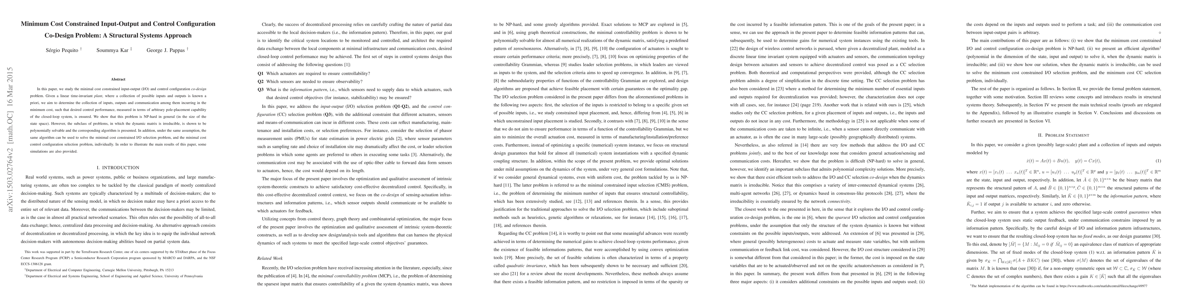 This paper addresses the NP-hard problem of determining the minimal cost configuration of inputs and outputs for a linear time-invariant plant to ensure desired control performance. For irreducible dynamic matrices, a polynomially solvable algorithm is presented, applicable to both I/O selection and control configuration selection.