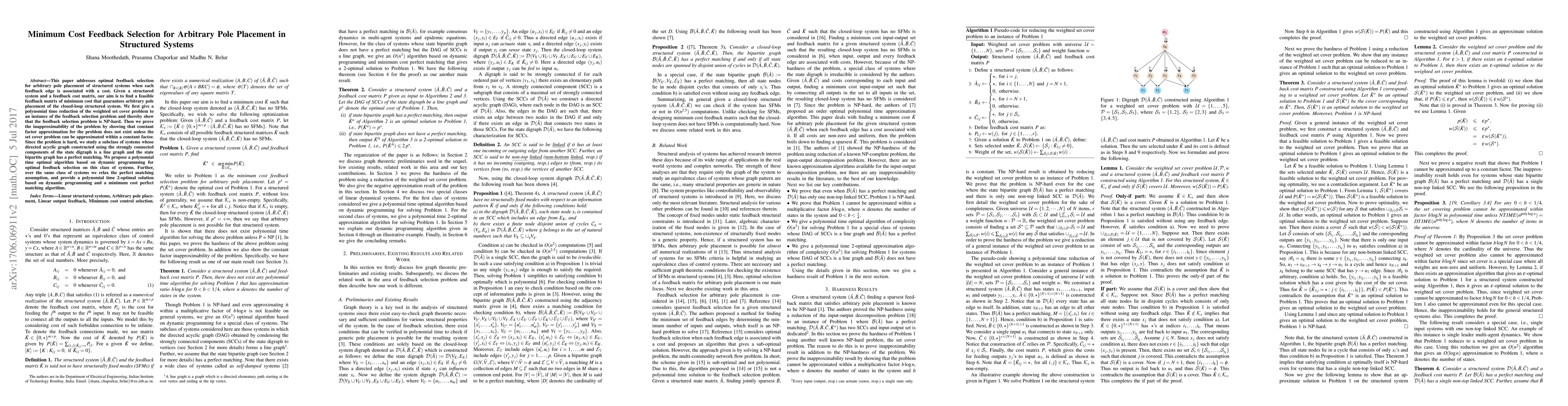 This paper develops optimal feedback selection methods for arbitrary pole placement in structured systems, showing that the problem is NP-hard and inapproximable. It proposes a polynomial time algorithm for a subclass of systems with specific graph structures and a 2-optimal solution for a relaxed version of the same subclass.