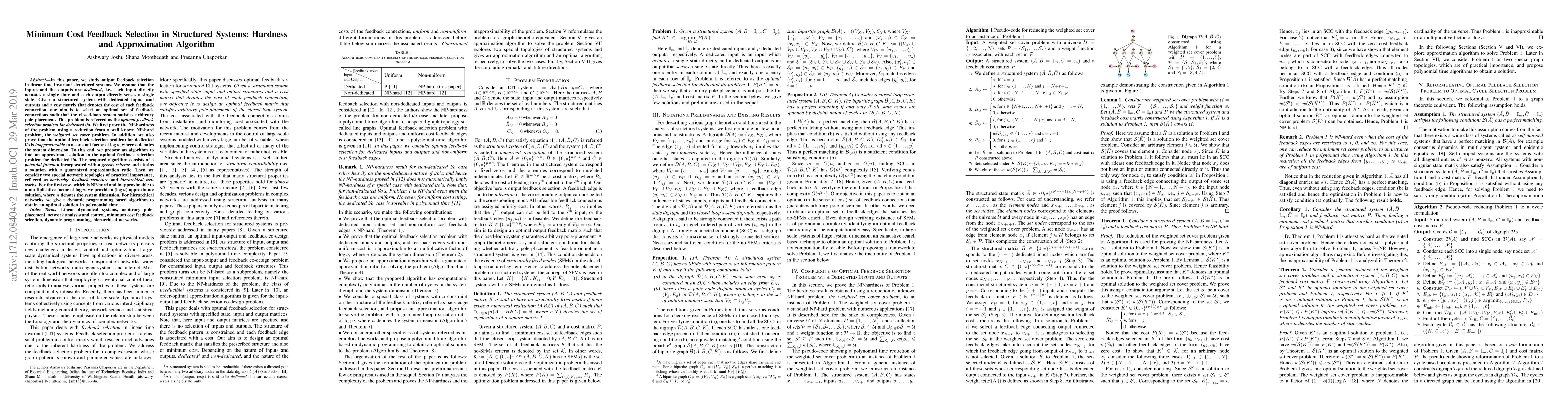 This paper investigates the optimal feedback selection problem in structured systems with dedicated inputs and outputs, proving its NP-hardness and inapproximability. It proposes a greedy algorithm with a guaranteed approximation ratio and provides specific solutions for back-edge feedback structures and hierarchical networks.