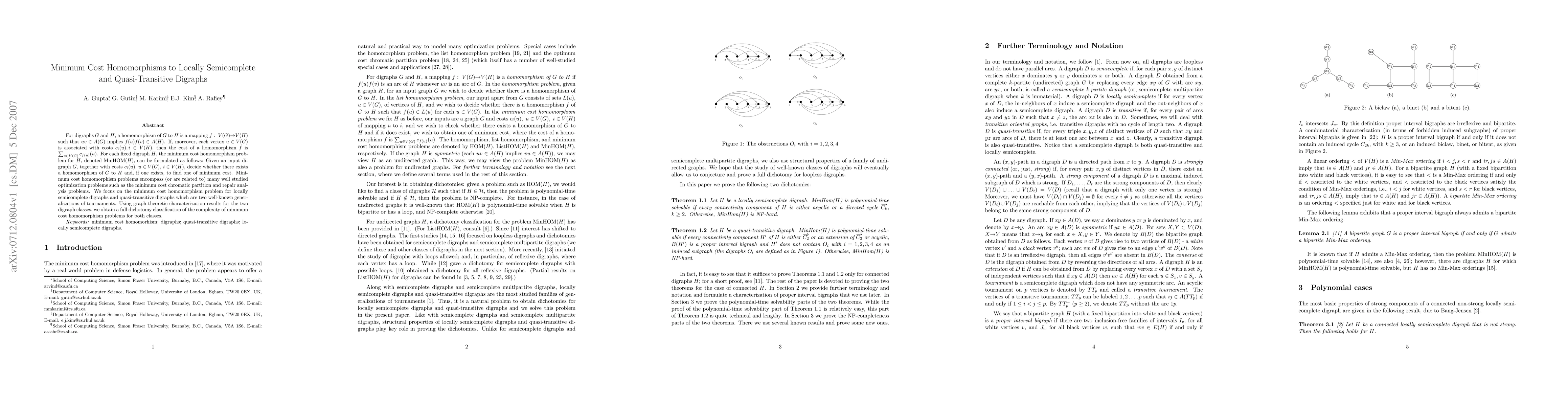 This paper studies the minimum cost homomorphism problem for locally semicomplete and quasi-transitive digraphs, focusing on the complexity of finding the least costly mappings from one digraph to another. It provides a complete classification of the problem's complexity for these two classes of digraphs.
