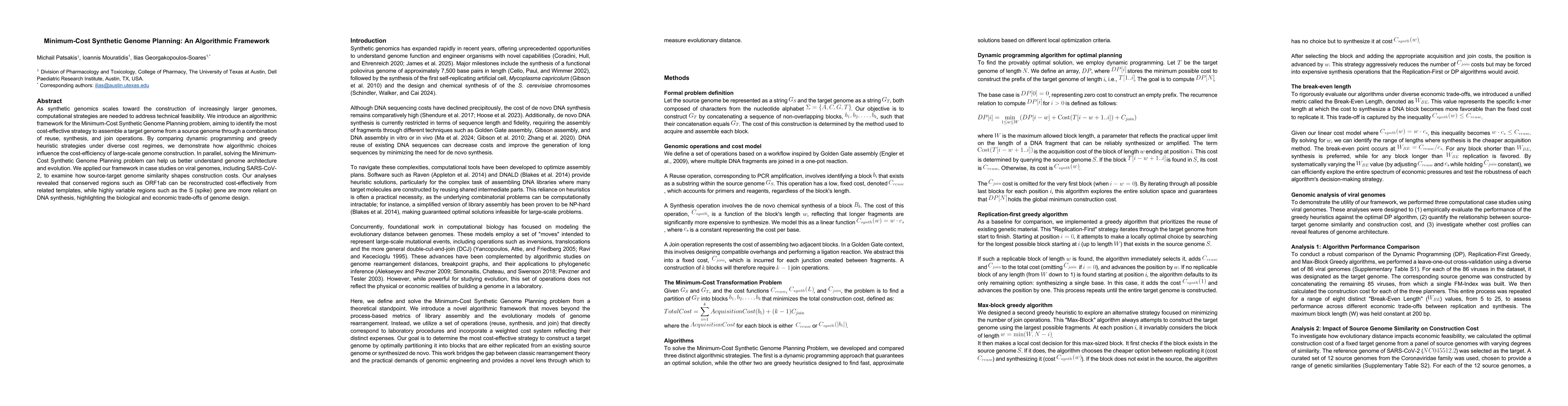 As synthetic genomics scales toward the construction of increasingly larger genomes, computational strategies are needed to address technical feasibility. We introduce an algorithmic framework for the Minimum-Cost Synthetic Genome Planning problem, aiming to identify the most cost-effective strategy to assemble a target genome from a source genome through a combination of reuse, synthesis, and join operations. By comparing dynamic programming and greedy heuristic strategies under diverse cost regimes, we demonstrate how algorithmic choices influence the cost-efficiency of large-scale genome construction. In parallel, solving the Minimum-Cost Synthetic Genome Planning problem can help us better understand genome architecture and evolution. We applied our framework in case studies on viral genomes, including SARS-CoV-2, to examine how source-target genome similarity shapes construction costs. Our analyses revealed that conserved regions such as ORF1ab can be reconstructed cost-effectively from related templates, while highly variable regions such as the S (spike) gene are more reliant on DNA synthesis, highlighting the biological and economic trade-offs of genome design.