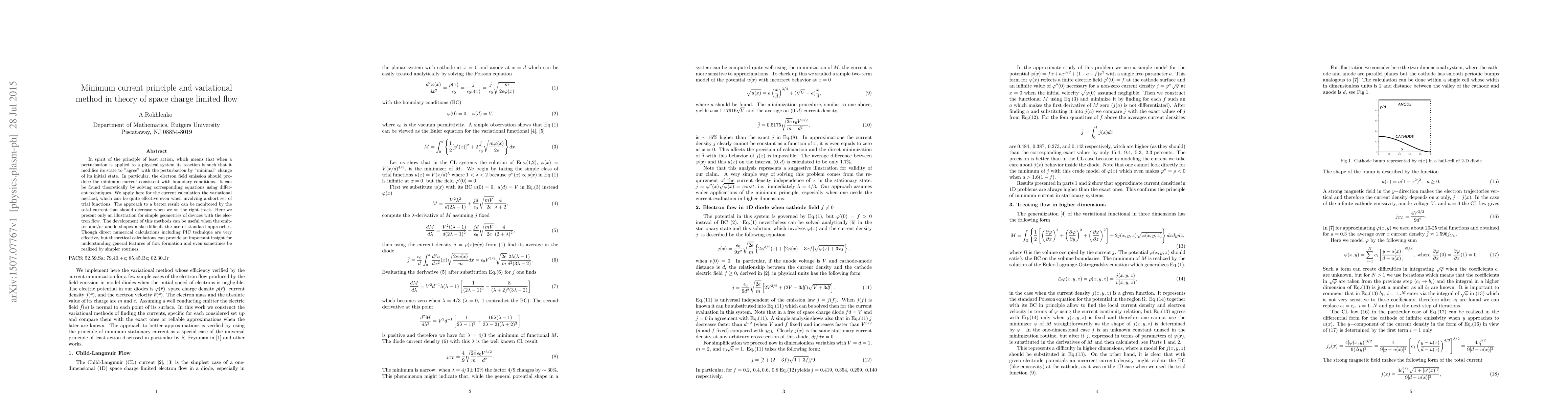 In spirit of the principle of least action, which means that when a perturbation is applied to a physical system its reaction is such that it modifies its state to "agree" with the perturbation by "minimal" change of its initial state. In particular, the electron field emission should produce the minimum current consistent with boundary conditions. It can be found theoretically by solving corresponding equations using different techniques. We apply here for the current calculation the variational method, which can be quite effective even when involving a short set of trial functions. The approach to a better result can be monitored by the total current that should decrease when we on the right track. Here we present only an illustration for simple geometries of devices with the electron flow. The development of this methods can be useful when the emitter and/or anode shapes make difficult the use of standard approaches. Though direct numerical calculations including PIC technique are very effective, but theoretical calculations can provide an important insight for understanding general features of flow formation and even sometimes be realized by simpler routines.