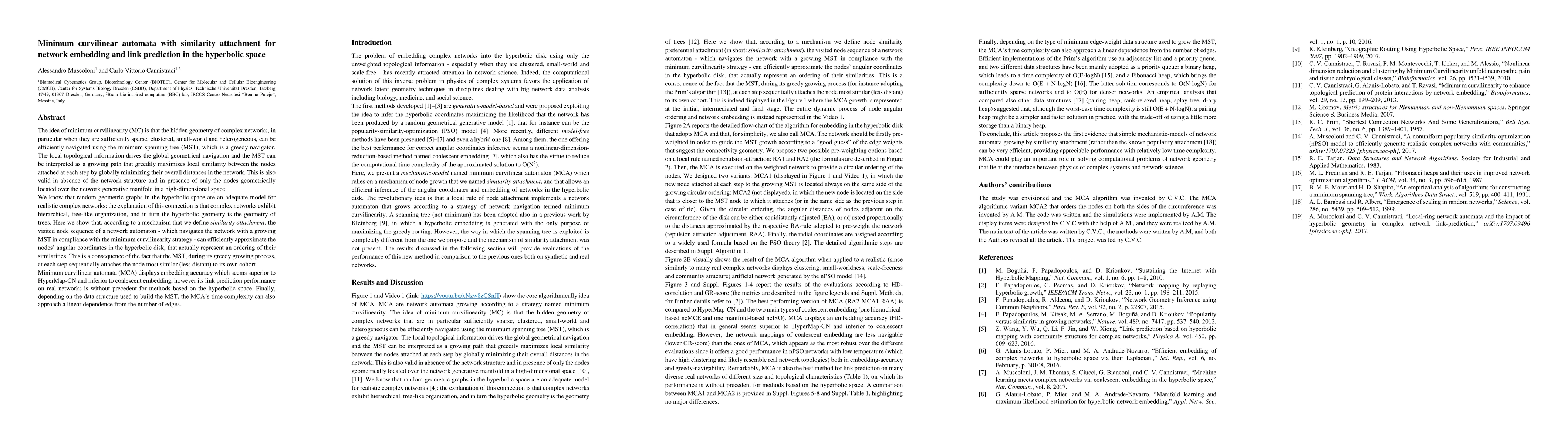 This paper proposes minimum curvilinear automata (MCA) for network embedding and link prediction in hyperbolic space, leveraging the minimum spanning tree (MST) to navigate complex networks efficiently. MCA's similarity attachment mechanism attaches nodes based on local similarity, achieving superior link prediction performance compared to other hyperbolic embedding methods.
