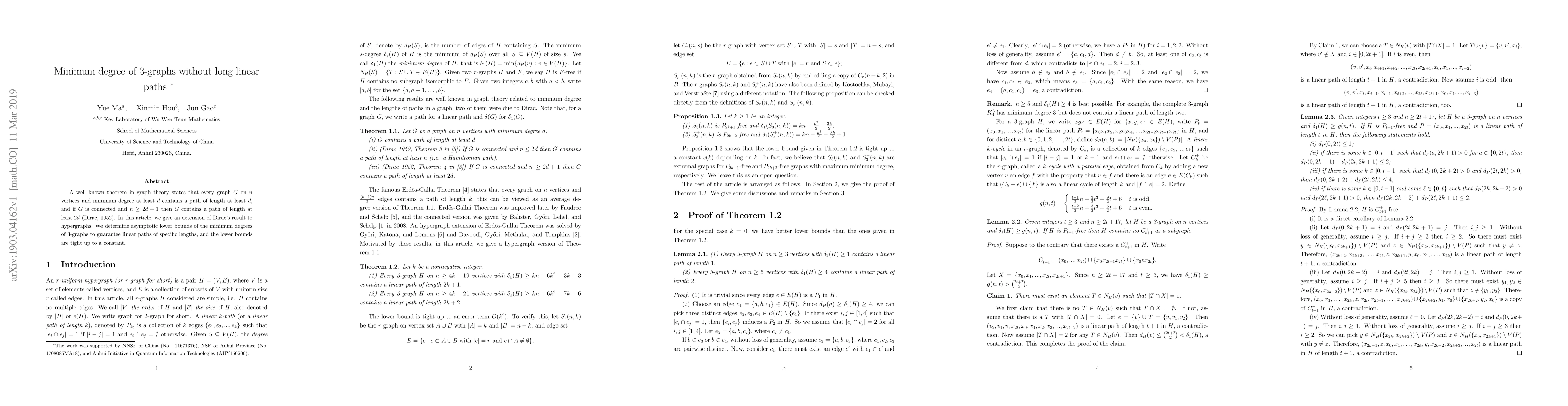 A well known theorem in graph theory states that every graph $G$ on $n$ vertices and minimum degree at least $d$ contains a path of length at least $d$, and if $G$ is connected and $n\ge 2d+1$ then $G$ contains a path of length at least $2d$ (Dirac, 1952). In this article, we give an extension of Dirac's result to hypergraphs. We determine asymptotic lower bounds of the minimum degrees of 3-graphs to guarantee linear paths of specific lengths, and the lower bounds are tight up to a constant.