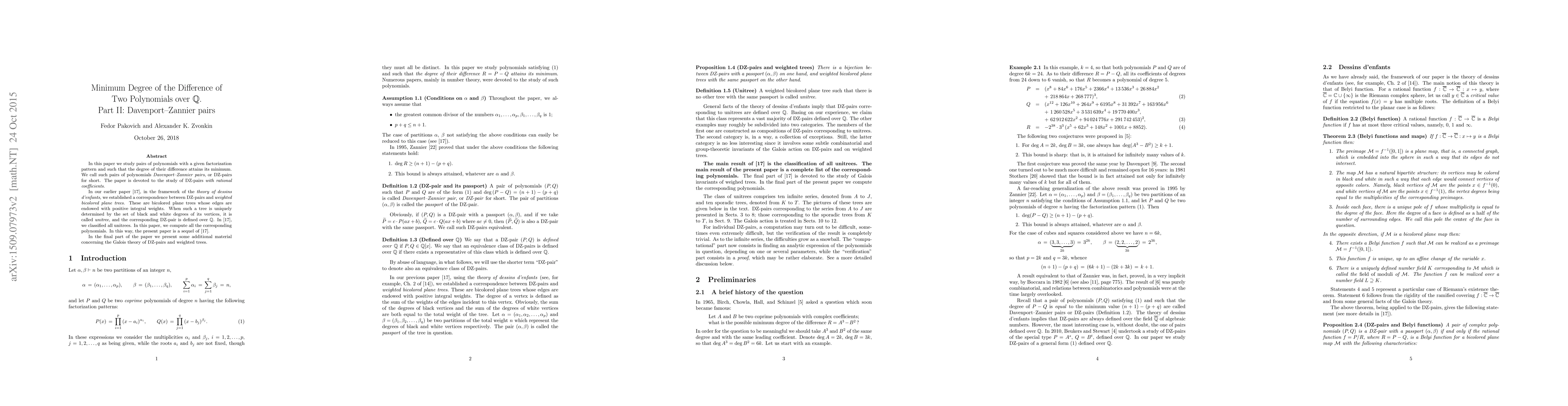 In this paper we study pairs of polynomials with a given factorization pattern and such that the degree of their difference attains its minimum. We call such pairs of polynomials Davenport--Zannier pairs, or DZ-pairs for short. The paper is devoted to the study of DZ-pairs with rational coefficients. In our earlier paper, in the framework of the theory of dessins d'enfants, we established a correspondence between DZ-pairs and weighted bicolored plane trees. These are bicolored plane trees whose edges are endowed with positive integral weights. When such a tree is uniquely determined by the set of black and white degrees of its vertices, it is called unitree, and the corresponding DZ-pair is defined over $\mathbb Q$. In our earlier paper, we classified all unitrees. In this paper, we compute all the corresponding polynomials. In the final part of the paper we present some additional material concerning the Galois theory of DZ-pairs and weighted trees.