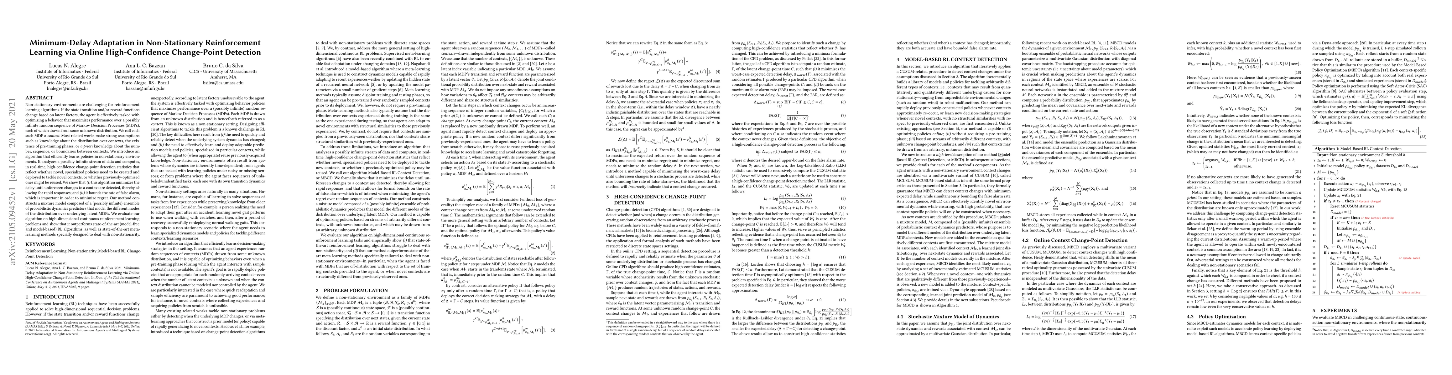 Non-stationary environments are challenging for reinforcement learning algorithms. If the state transition and/or reward functions change based on latent factors, the agent is effectively tasked with optimizing a behavior that maximizes performance over a possibly infinite random sequence of Markov Decision Processes (MDPs), each of which drawn from some unknown distribution. We call each such MDP a context. Most related works make strong assumptions such as knowledge about the distribution over contexts, the existence of pre-training phases, or a priori knowledge about the number, sequence, or boundaries between contexts. We introduce an algorithm that efficiently learns policies in non-stationary environments. It analyzes a possibly infinite stream of data and computes, in real-time, high-confidence change-point detection statistics that reflect whether novel, specialized policies need to be created and deployed to tackle novel contexts, or whether previously-optimized ones might be reused. We show that (i) this algorithm minimizes the delay until unforeseen changes to a context are detected, thereby allowing for rapid responses; and (ii) it bounds the rate of false alarm, which is important in order to minimize regret. Our method constructs a mixture model composed of a (possibly infinite) ensemble of probabilistic dynamics predictors that model the different modes of the distribution over underlying latent MDPs. We evaluate our algorithm on high-dimensional continuous reinforcement learning problems and show that it outperforms state-of-the-art (model-free and model-based) RL algorithms, as well as state-of-the-art meta-learning methods specially designed to deal with non-stationarity.