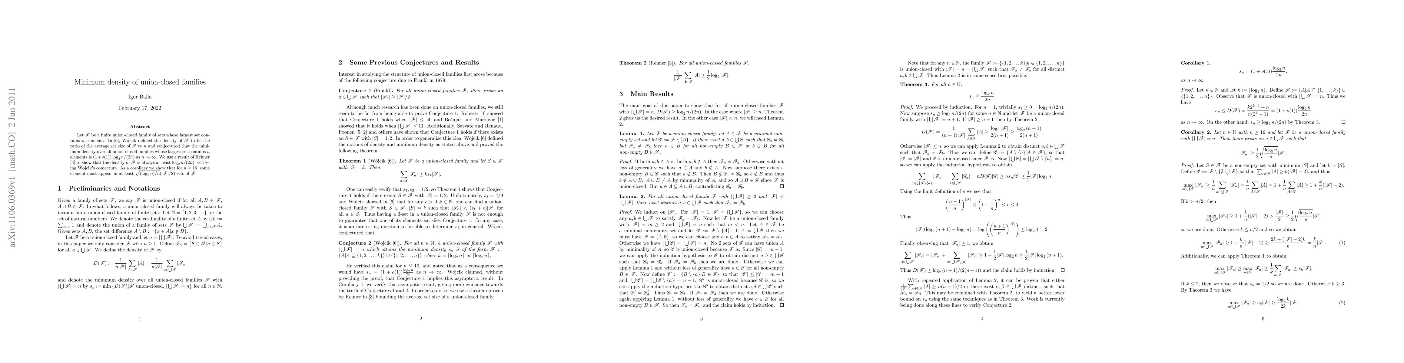 This paper verifies Wojcik's conjecture that the minimum density of a union-closed family of sets is asymptotically (1 + o(1))log_2(n)/(2n) as n approaches infinity. It also proves that for n ≥ 16, some element must appear in at least √(log_2(n)/n)(|F|/2) sets within the family.