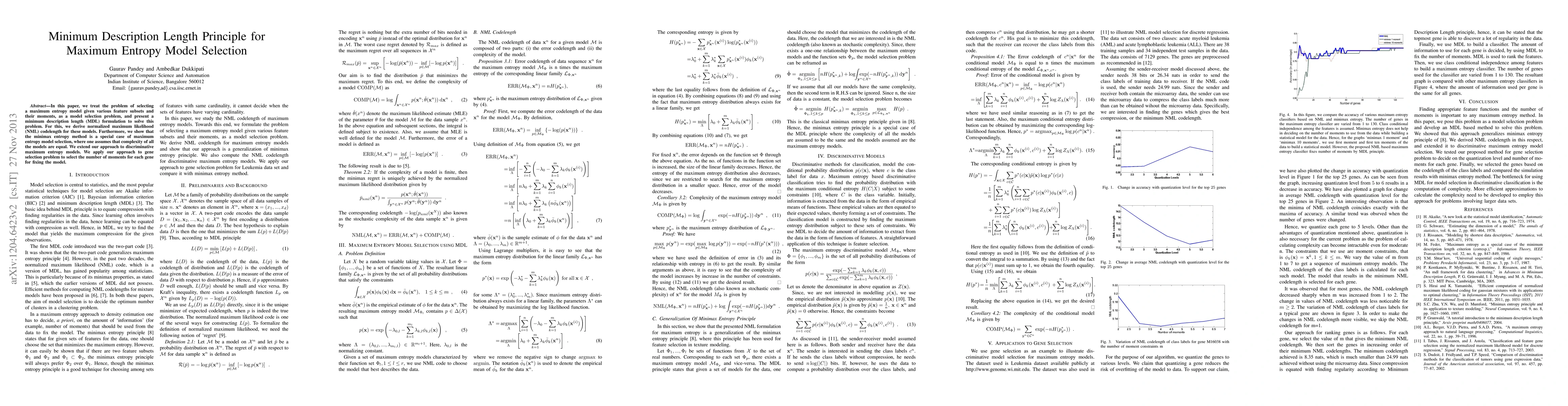 Model selection is central to statistics, and many learning problems can be formulated as model selection problems. In this paper, we treat the problem of selecting a maximum entropy model given various feature subsets and their moments, as a model selection problem, and present a minimum description length (MDL) formulation to solve this problem. For this, we derive normalized maximum likelihood (NML) codelength for these models. Furthermore, we prove that the minimax entropy principle is a special case of maximum entropy model selection, where one assumes that complexity of all the models are equal. We apply our approach to gene selection problem and present simulation results.