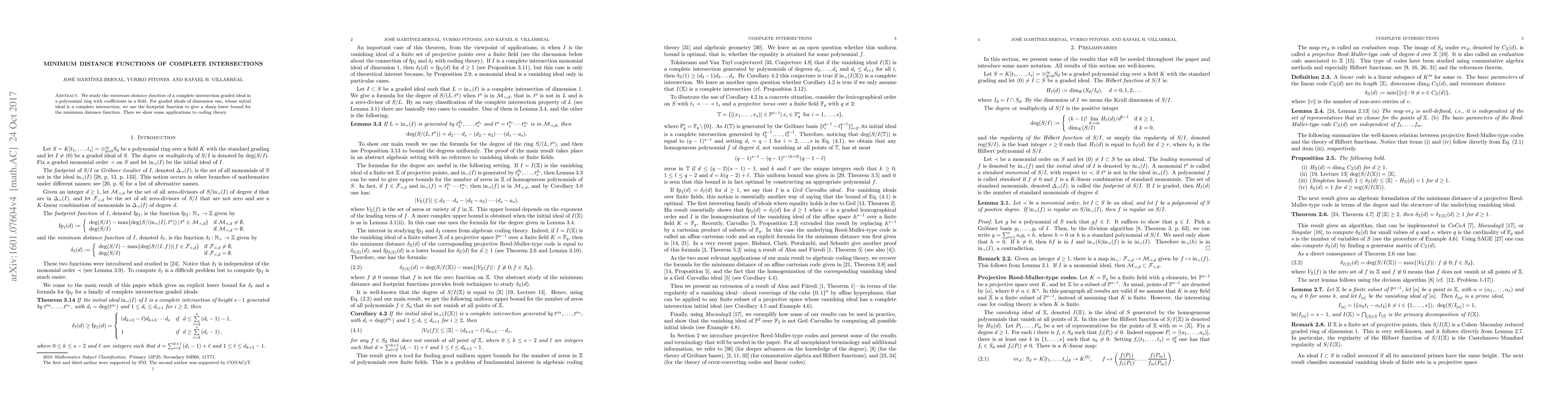 We study the footprint function, with respect to a monomial order, of complete intersection graded ideals in a polynomial ring with coefficients in a field. For graded ideals of dimension one, whose initial ideal is a complete intersection, we give a formula for the footprint function and a sharp lower bound for the corresponding minimum distance function. This allows us to recover a formula for the minimum distance of an affine cartesian code and the fact that in this case the minimum distance and the footprint functions coincide. Then we present an extension of a result of Alon and F\"uredi, about coverings of the cube $\{0,1\}^n$ by affine hyperplanes, in terms of the regularity of a vanishing ideal.