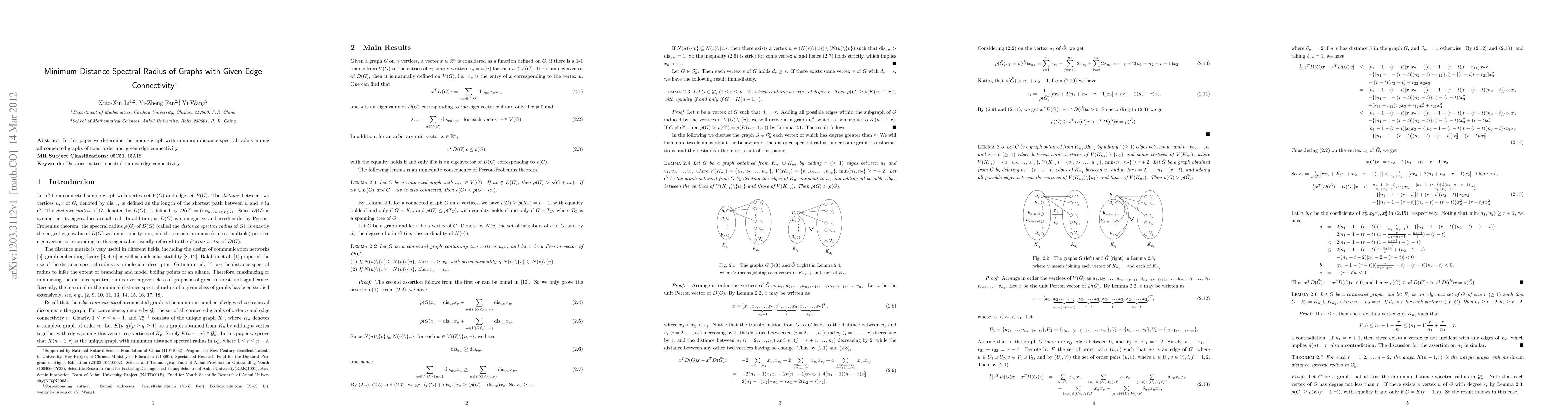 Summary: This paper identifies the unique connected graph with the smallest distance spectral radius among all graphs of a fixed number of vertices and a specified edge connectivity. The result provides insights into graph structure and spectral properties.