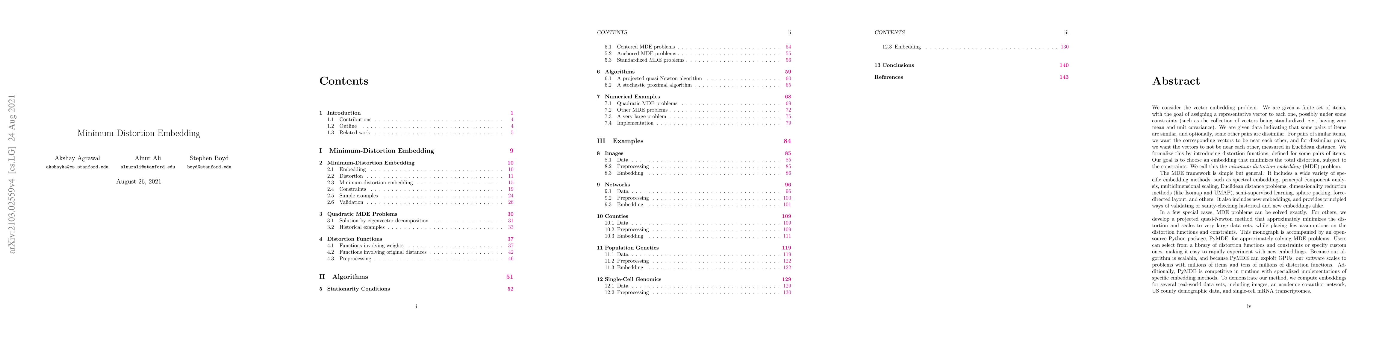 This paper introduces the minimum-distortion embedding (MDE) framework to assign representative vectors to a set of items based on similarity and dissimilarity data, aiming to minimize distortion. It presents a scalable projected quasi-Newton method and an open-source Python package, PyMDE, to implement and experiment with various distortion functions and constraints, demonstrating its application on diverse real-world datasets.