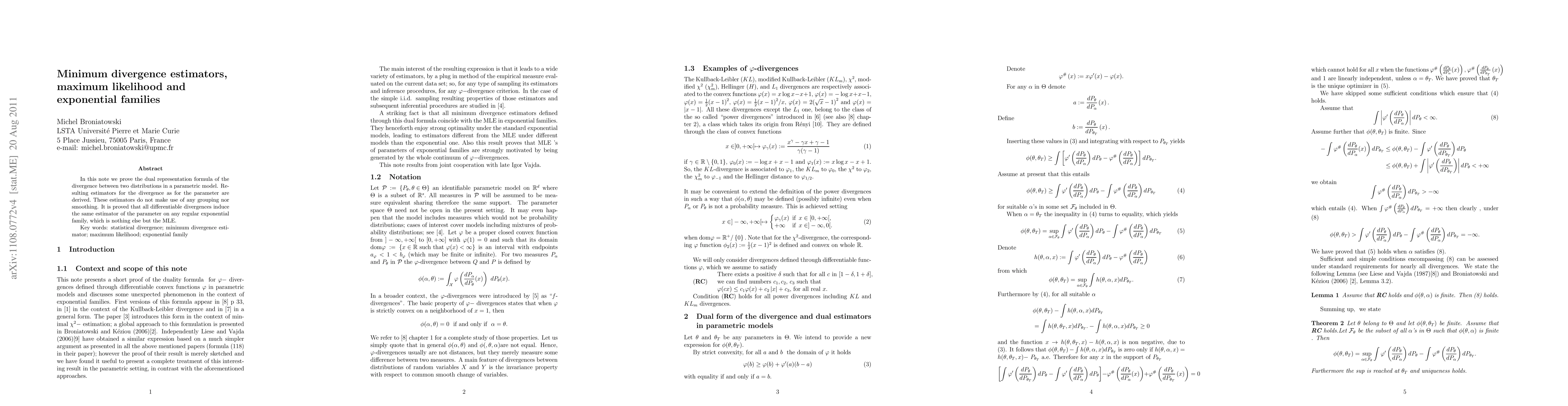 In this note we prove the dual representation formula of the divergence between two distributions in a parametric model. Resulting estimators for the divergence as for the parameter are derived. These estimators do not make use of any grouping nor smoothing. It is proved that all differentiable divergences induce the same estimator of the parameter on any regular exponential family, which is nothing else but the MLE.