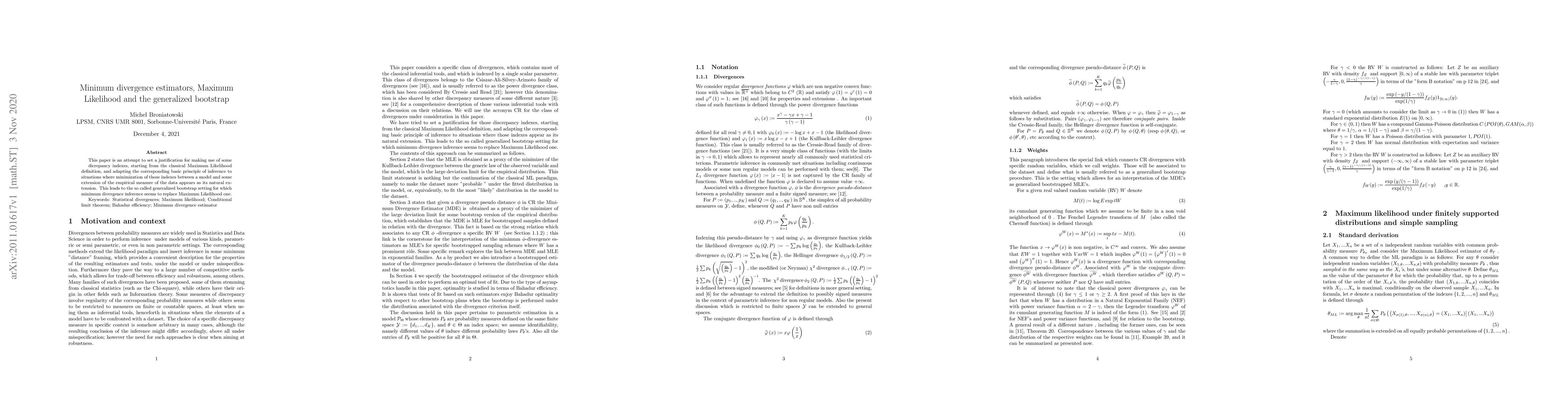 This paper is an attempt to set a justification for making use of some dicrepancy indexes, starting from the classical Maximum Likelihood definition, and adapting the corresponding basic principle of inference to situations where minimization of those indexes between a model and some extension of the empirical measure of the data appears as its natural extension. This leads to the so called generalized bootstrap setting for which minimum divergence inference seems to replace Maximum Likelihood one. 1 Motivation and context Divergences between probability measures are widely used in Statistics and Data Science in order to perform inference under models of various kinds, paramet-ric or semi parametric, or even in non parametric settings. The corresponding methods extend the likelihood paradigm and insert inference in some minimum "distance" framing, which provides a convenient description for the properties of the resulting estimators and tests, under the model or under misspecifica-tion. Furthermore they pave the way to a large number of competitive methods , which allows for trade-off between efficiency and robustness, among others. Many families of such divergences have been proposed, some of them stemming from classical statistics (such as the Chi-square), while others have their origin in other fields such as Information theory. Some measures of discrepancy involve regularity of the corresponding probability measures while others seem to be restricted to measures on finite or countable spaces, at least when using them as inferential tools, henceforth in situations when the elements of a model have to be confronted with a dataset. The choice of a specific discrepancy measure in specific context is somehow arbitrary in many cases, although the resulting conclusion of the inference might differ accordingly, above all under misspecification; however the need for such approaches is clear when aiming at robustness.