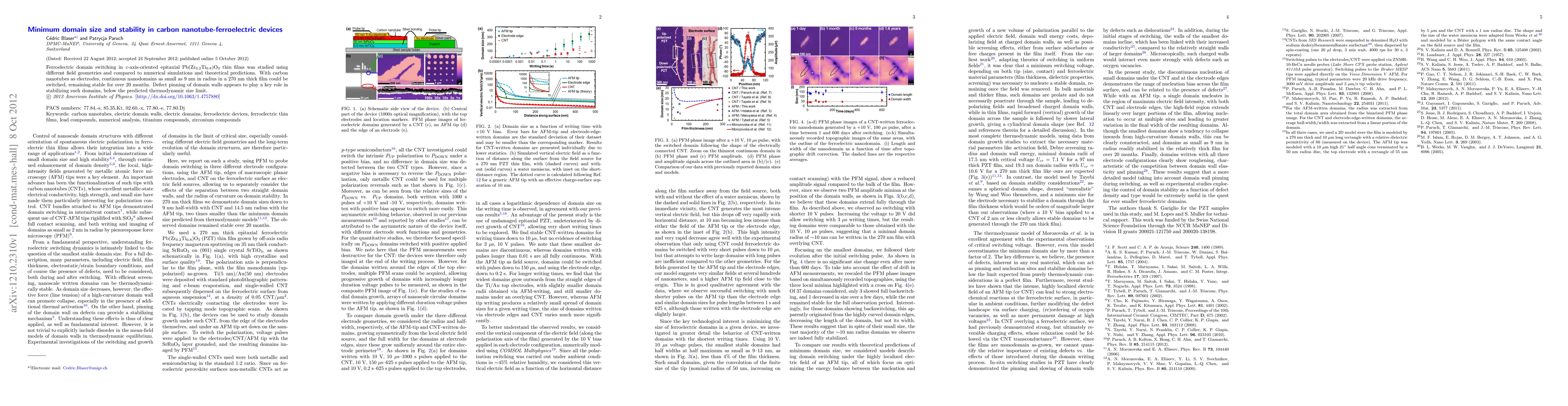 This study investigates ferroelectric domain switching in Pb(Zr0.2Ti0.8)O3 thin films with carbon nanotube electrodes, achieving stable switching of 9 nm radius nanodomains over 20 months, suggesting defect pinning stabilizes domains below theoretical limits. Numerical simulations and theoretical predictions support these findings.