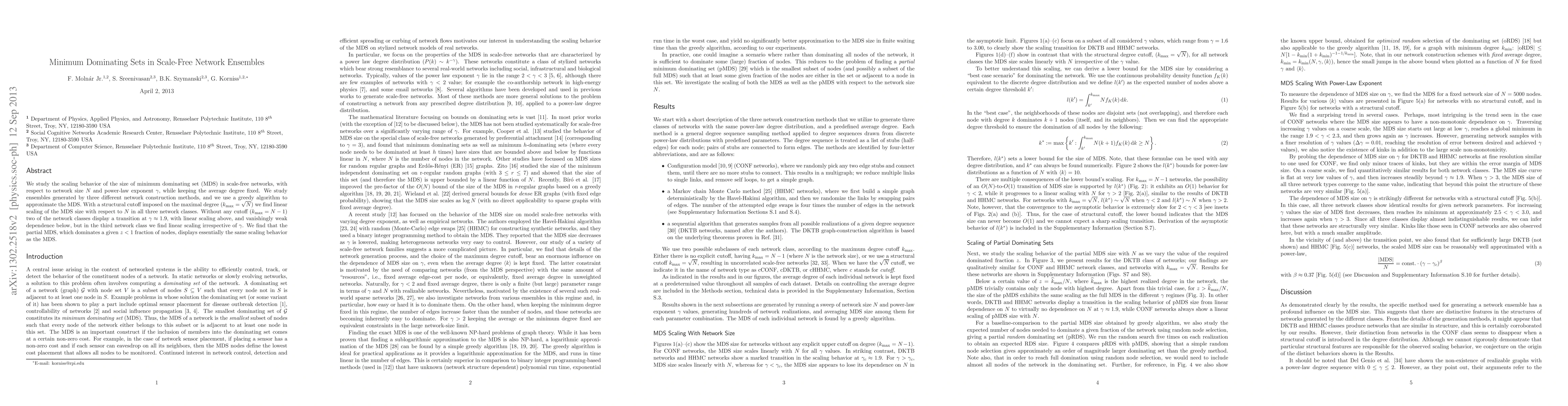 We study the scaling behavior of the size of minimum dominating set (MDS) in scale-free networks, with respect to network size $N$ and power-law exponent $\gamma$, while keeping the average degree fixed. We study ensembles generated by three different network construction methods, and we use a greedy algorithm to approximate the MDS. With a structural cutoff imposed on the maximal degree ($k_{\max}=\sqrt{N}$) we find linear scaling of the MDS size with respect to $N$ in all three network classes. Without any cutoff ($k_{\max}=N-1$) two of the network classes display a transition at $\gamma \approx 1.9$, with linear scaling above, and vanishingly weak dependence below, but in the third network class we find linear scaling irrespective of $\gamma$. We find that the partial MDS, which dominates a given $z<1$ fraction of nodes, displays essentially the same scaling behavior as the MDS.