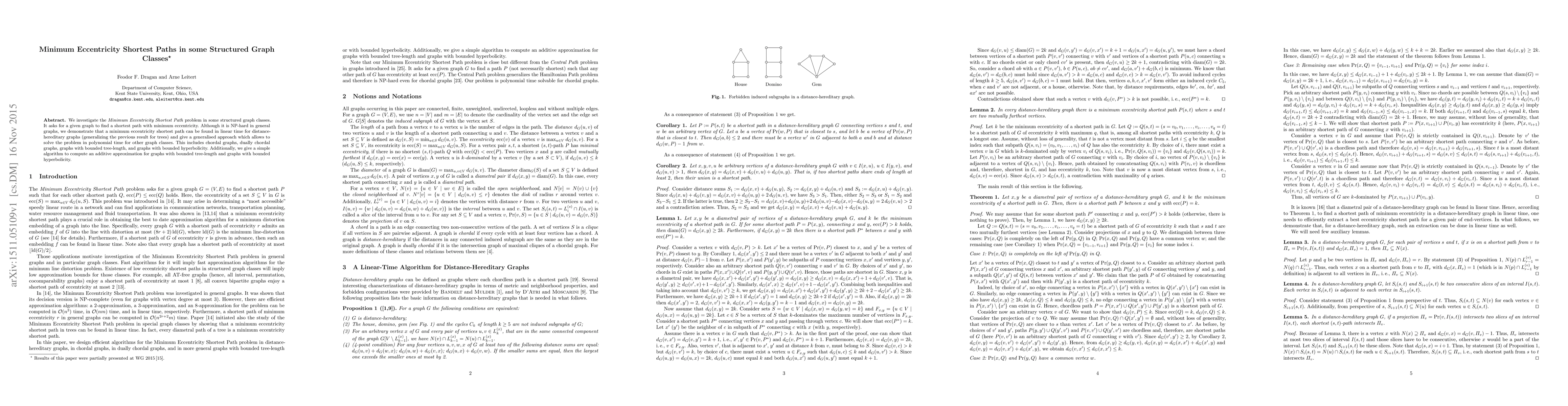 This paper addresses the Minimum Eccentricity Shortest Path problem in structured graph classes, showing linear-time solutions for distance-hereditary graphs and polynomial-time approaches for chordal, dually chordal, and graphs with bounded tree-length or hyperbolicity. It also provides an additive approximation algorithm for the latter two classes.