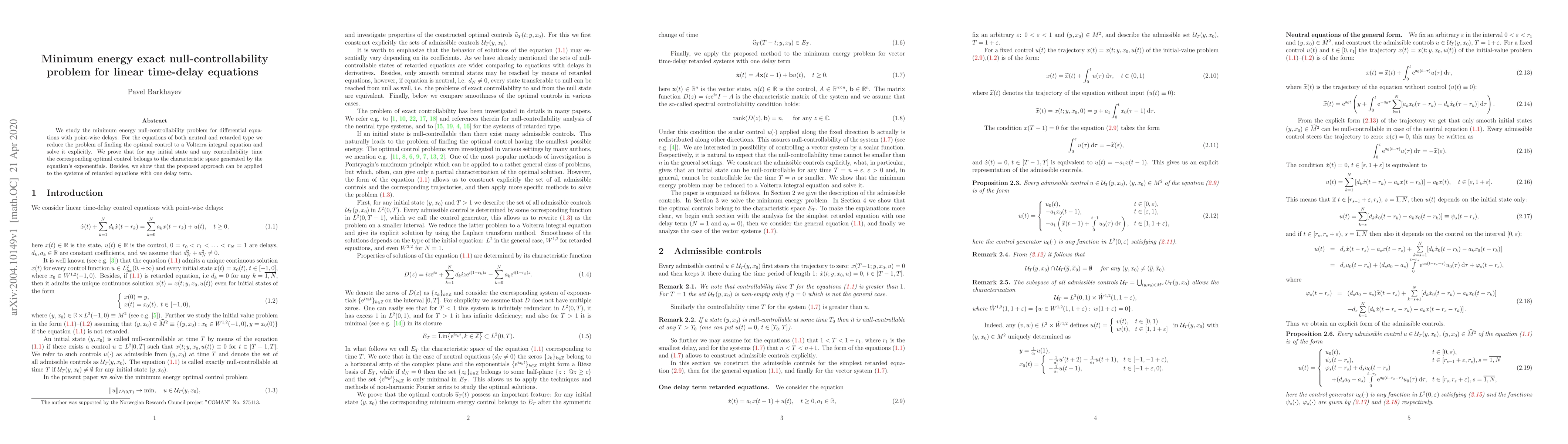This paper explores the minimum energy null-controllability for linear time-delay differential equations, reducing the problem to a solvable Volterra integral equation. The authors prove that the optimal control lies within the characteristic space of the equation's exponentials and demonstrate the method's applicability to systems with one delay term.