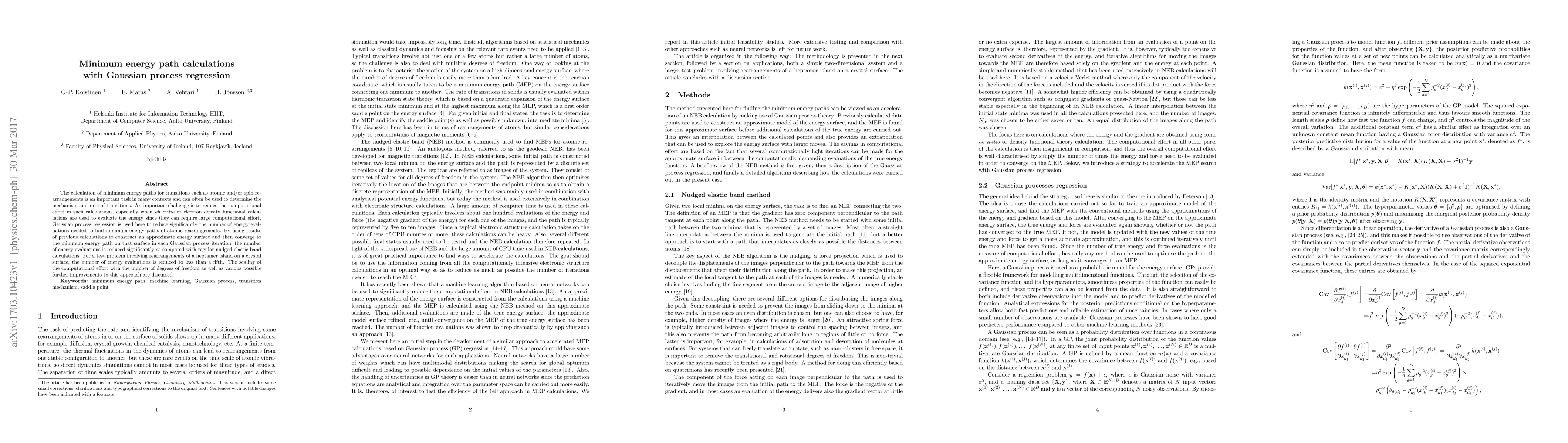 This paper employs Gaussian process regression to efficiently calculate minimum energy paths for atomic rearrangements, significantly reducing computational effort compared to traditional methods. The approach uses prior energy evaluations to construct an approximate energy surface, achieving a reduction of energy evaluations by more than 80% in tested cases.