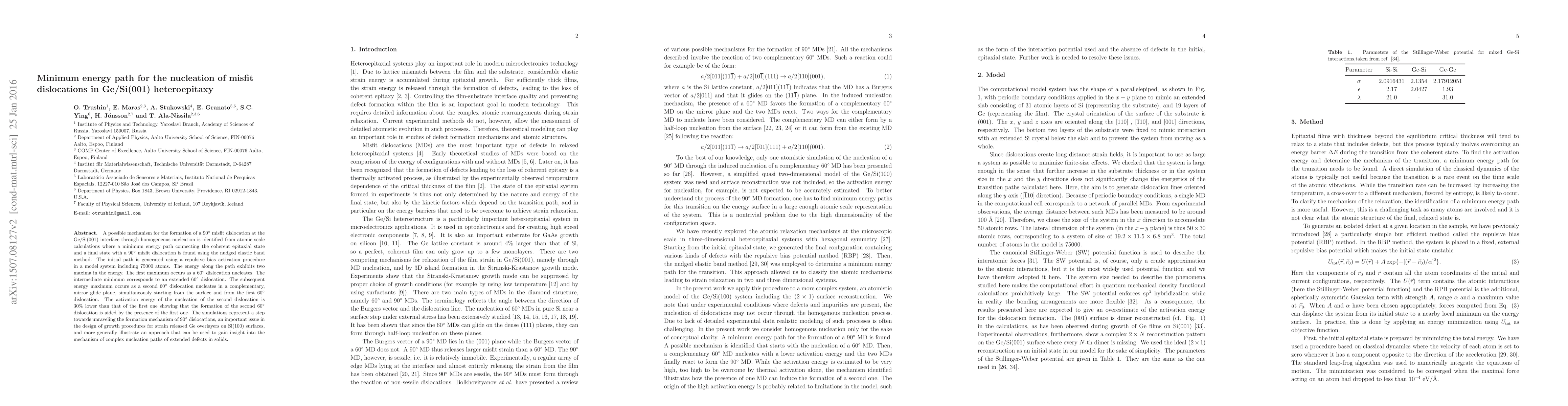 This study identifies a minimum energy path for the formation of a 90° misfit dislocation in Ge/Si(001) heteroepitaxy using atomic scale calculations and the nudged elastic band method. The simulations reveal that the formation of a second 60° dislocation is 30% easier when the first one is already present, providing insight into the nucleation mechanism of extended defects in solids.