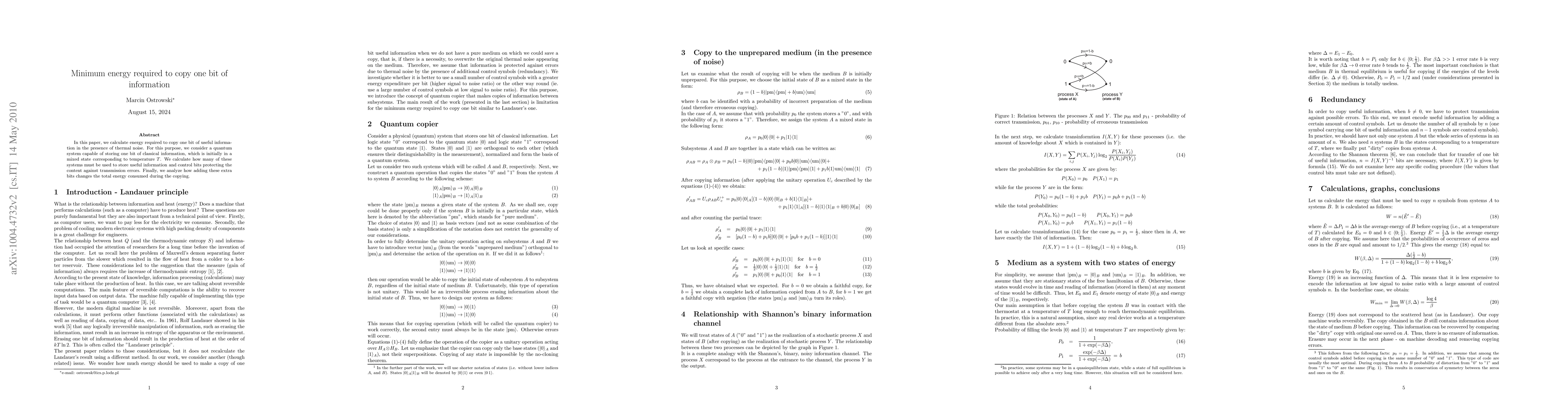 In this paper, we calculate energy required to copy one bit of useful information in the presence of thermal noise. For this purpose, we consider a quantum system capable of storing one bit of classical information, which is initially in a mixed state corresponding to temperature T. We calculate how many of these systems must be used to store useful information and control bits protecting the content against transmission errors. Finally, we analyze how adding these extra bits changes the total energy consumed during the copying.