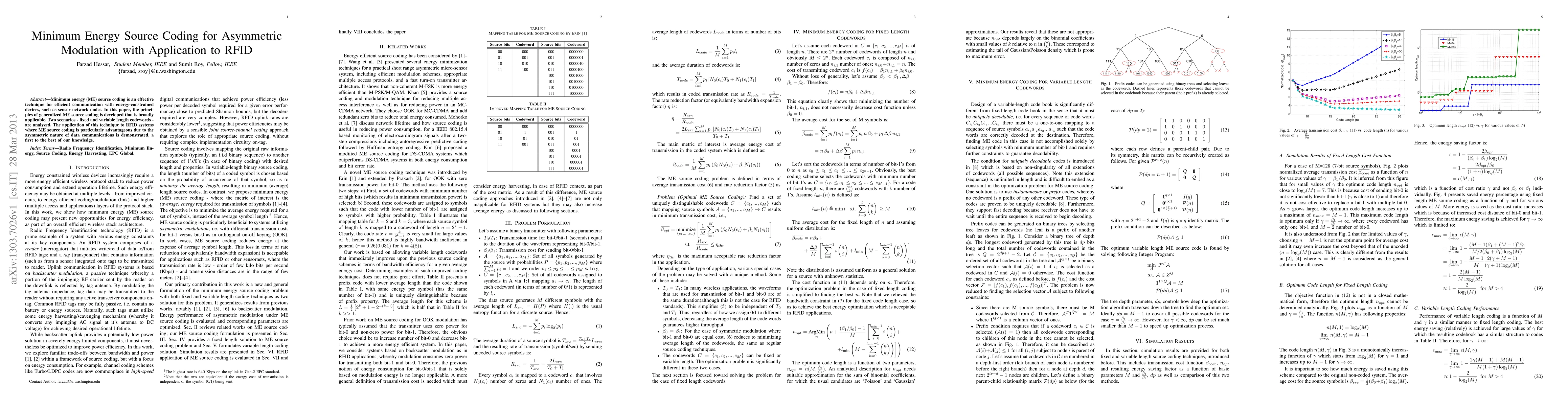 This paper develops generalized minimum energy source coding principles applicable to asymmetric modulation, analyzing both fixed and variable length codewords. It demonstrates the technique's application to RFID systems, highlighting its advantages due to the asymmetric nature of data communications in such constrained environments.