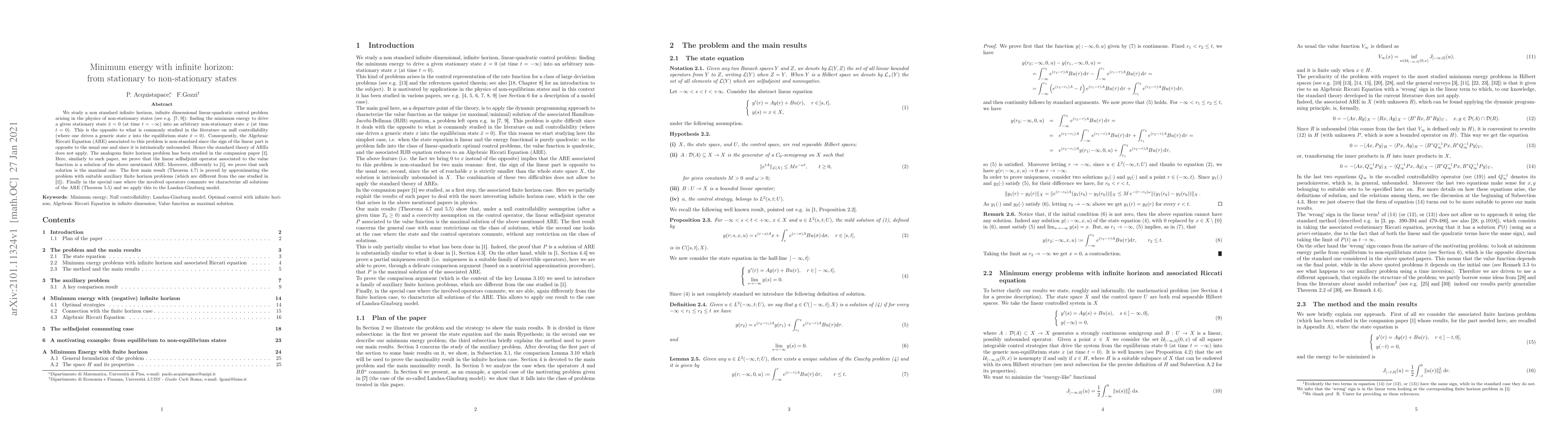 We study a non standard infinite horizon, infinite dimensional linear-quadratic control problem arising in the physics of non-stationary states (see e.g. \cite{BDGJL4,BertiniGabrielliLebowitz05}): finding the minimum energy to drive a given stationary state $\bar x=0$ (at time $t=-\infty$) into an arbitrary non-stationary state $x$ (at time $t=0$). This is the opposite to what is commonly studied in the literature on null controllability (where one drives a generic state $x$ into the equilibrium state $\bar x=0$). Consequently, the Algebraic Riccati Equation (ARE) associated to this problem is non-standard since the sign of the linear part is opposite to the usual one and since it is intrinsically unbounded. Hence the standard theory of AREs does not apply. The analogous finite horizon problem has been studied in the companion paper \cite{AcquistapaceGozzi17}. Here, similarly to such paper, we prove that the linear selfadjoint operator associated to the value function is a solution of the above mentioned ARE. Moreover, differently to \cite{AcquistapaceGozzi17}, we prove that such solution is the maximal one. The first main result (Theorem \ref{th:maximalARE}) is proved by approximating the problem with suitable auxiliary finite horizon problems (which are different from the one studied in \cite{AcquistapaceGozzi17}). Finally in the special case where the involved operators commute we characterize all solutions of the ARE (Theorem \ref{th:sol=proj}) and we apply this to the Landau-Ginzburg model.