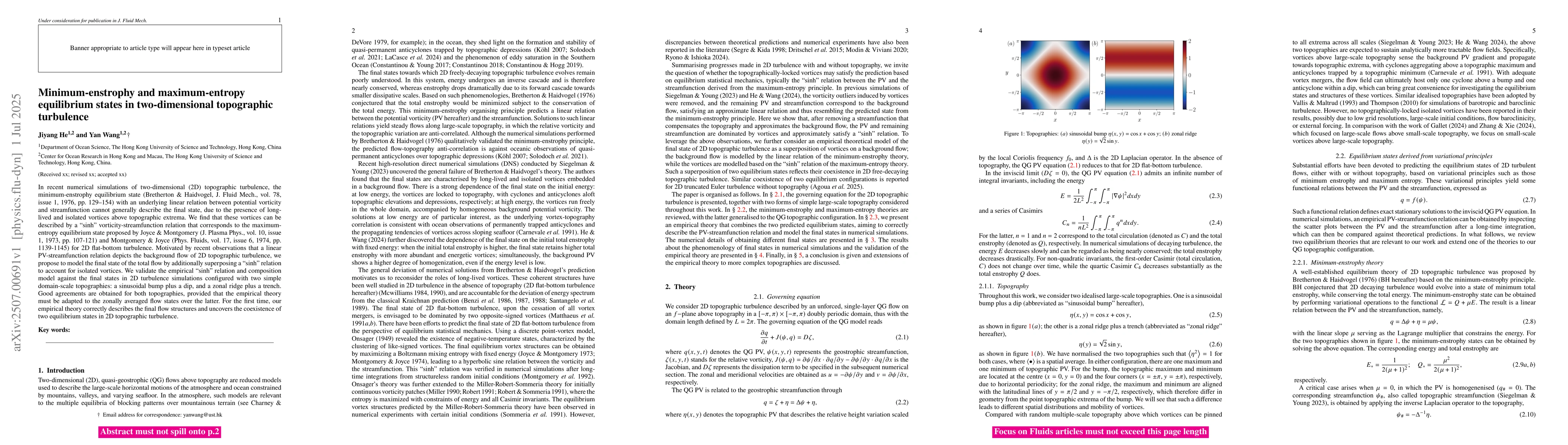 In recent numerical simulations of two-dimensional (2D) topographic turbulence, the minimum-enstrophy equilibrium state (Bretherton \& Haidvogel,J. Fluid Mech., vol. 78, issue 1, 1976, pp. 129-154) with an underlying linear relation between potential vorticity and streamfunction cannot generally describe the final state, due to the presence of long-lived and isolated vortices above topographic extrema. We find that these vortices can be described by a ``$\sinh$'' vorticity-streamfunction relation that corresponds to the maximum-entropy equilibrium state proposed by Joyce \& Montgomery (J. Plasma Phys., vol. 10, issue 1, 1973, pp. 107-121) and Montgomery \& Joyce (Phys. Fluids, vol. 17, issue 6, 1974, pp. 1139-1145) for 2D flat-bottom turbulence. Motivated by recent observations that a linear PV-streamfunction relation depicts the background flow of 2D topographic turbulence, we propose to model the final state of the total flow by additionally superposing a ``$\sinh$'' relation to account for isolated vortices. We validate the empirical ``$\sinh$'' relation and composition model against the final states in 2D turbulence simulations configured with two simple domain-scale topographies: a sinusoidal bump plus a dip, and a zonal ridge plus a trench. Good agreements are obtained for both topographies, provided that the empirical theory must be adapted to the zonally averaged flow states over the latter. For the first time, our empirical theory correctly describes the final flow structures and uncovers the coexistence of two equilibrium states in 2D topographic turbulence.