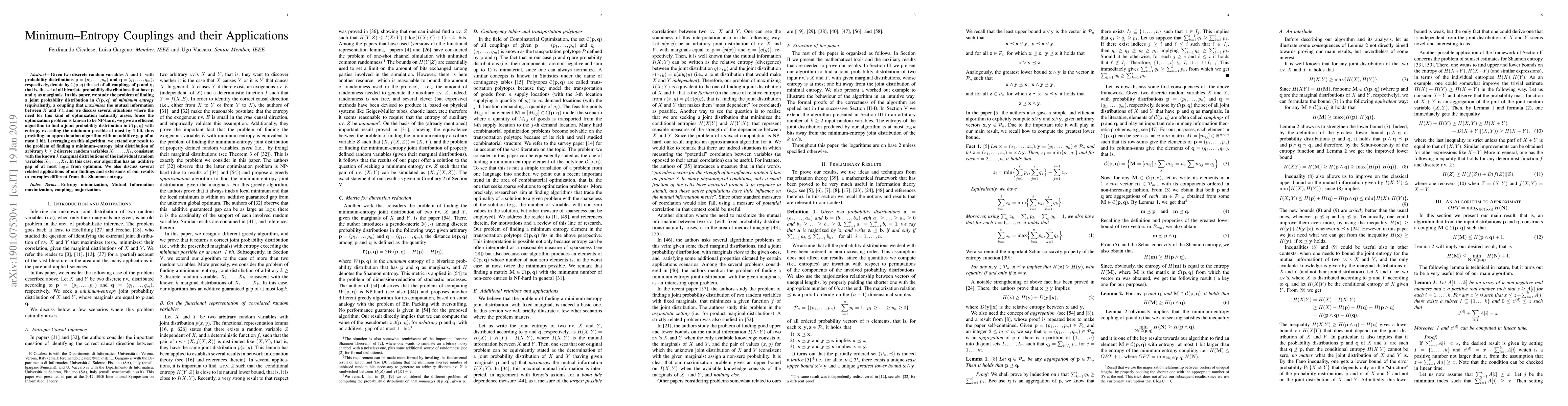 Given two discrete random variables $X$ and $Y,$ with probability distributions ${\bf p}=(p_1, \ldots , p_n)$ and ${\bf q}=(q_1, \ldots , q_m)$, respectively, denote by ${\cal C}({\bf p}, {\bf q})$ the set of all couplings of ${\bf p}$ and ${\bf q}$, that is, the set of all bivariate probability distributions that have ${\bf p}$ and ${\bf q}$ as marginals. In this paper, we study the problem of finding a joint probability distribution in ${\cal C}({\bf p}, {\bf q})$ of \emph{minimum entropy} (equivalently, a coupling that \emph{maximizes} the mutual information between $X$ and $Y$), and we discuss several situations where the need for this kind of optimization naturally arises. Since the optimization problem is known to be NP-hard, we give an efficient algorithm to find a joint probability distribution in ${\cal C}({\bf p}, {\bf q})$ with entropy exceeding the minimum possible at most by {1 bit}, thus providing an approximation algorithm with an additive gap of at most 1 bit. Leveraging on this algorithm, we extend our result to the problem of finding a minimum--entropy joint distribution of arbitrary $k\geq 2$ discrete random variables $X_1, \ldots , X_k$, consistent with the known $k$ marginal distributions of the individual random variables $X_1, \ldots , X_k$. In this case, our algorithm has an { additive gap of at most $\log k$ from optimum.} We also discuss several related applications of our findings and {extensions of our results to entropies different from the Shannon entropy.}
