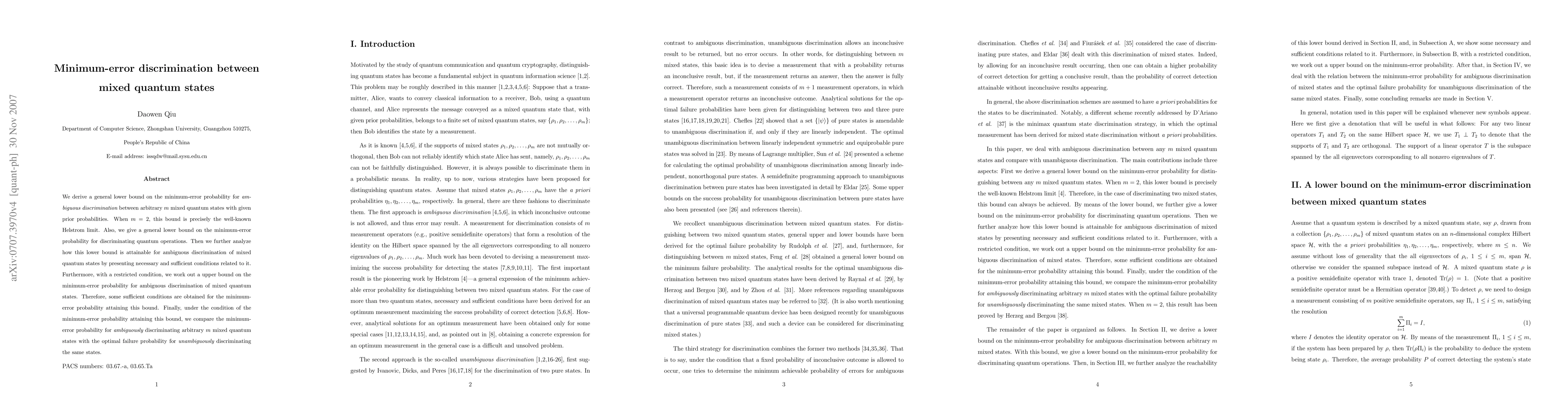 This paper establishes lower bounds for the minimum-error probability in discriminating between $m$ mixed quantum states, deriving the Helstrom limit for $m=2$ and conditions for attaining this bound. It also compares the minimum-error probability for ambiguous discrimination with the optimal failure probability for unambiguous discrimination.