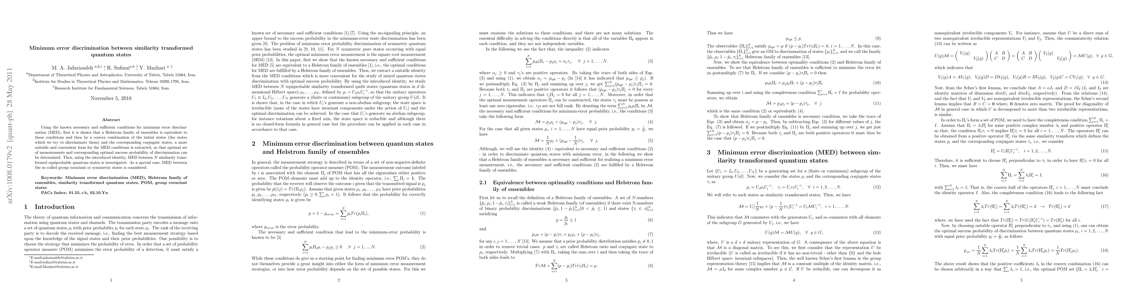 This paper explores minimum error discrimination (MED) for quantum states, demonstrating that a Helstrom family of ensembles satisfies the necessary and sufficient conditions for MED. It derives a more convenient form for MED conditions through convex combinations of initial and conjugate states, enabling the determination of optimal measurements and success probabilities. The study further investigates MED between N similarity transformed equiprobable quantum states, with a focus on group covariant or symmetric states.