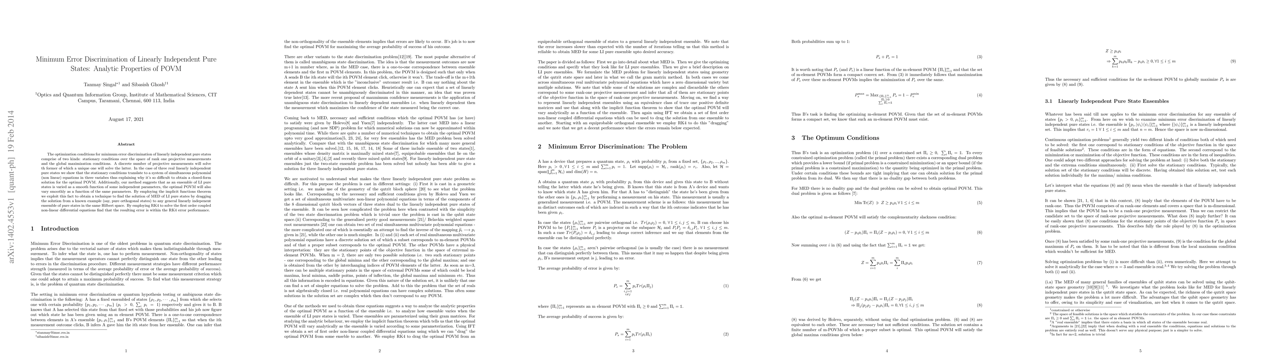 Researchers find that optimizing minimum error discrimination of linearly independent pure states requires solving a system of simultaneous polynomial equations and propose a method to solve this problem using implicit functions theorem.