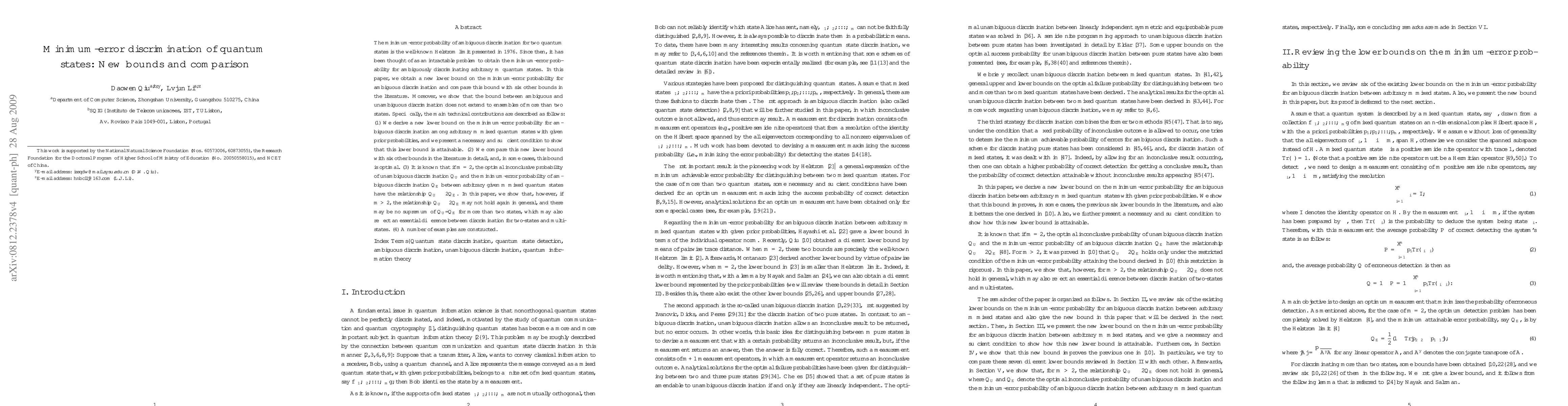 The paper introduces a novel lower bound for minimum-error discrimination of quantum states, along with a condition for its attainability, and proves that the relationship between unambiguous and ambiguous discrimination does not generalize to more than two states.